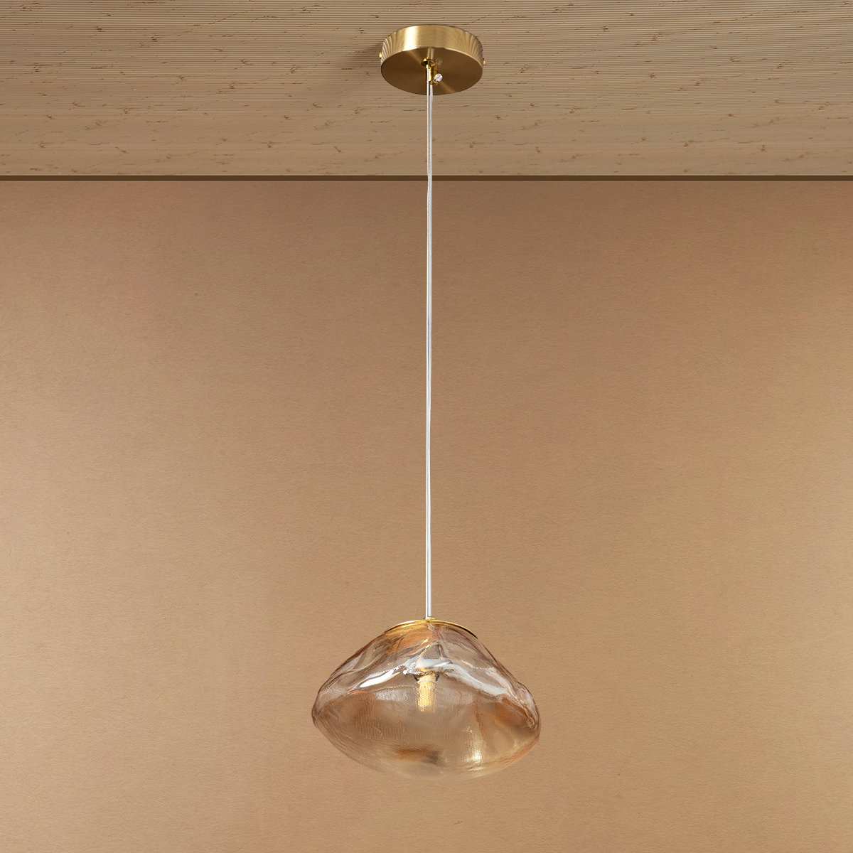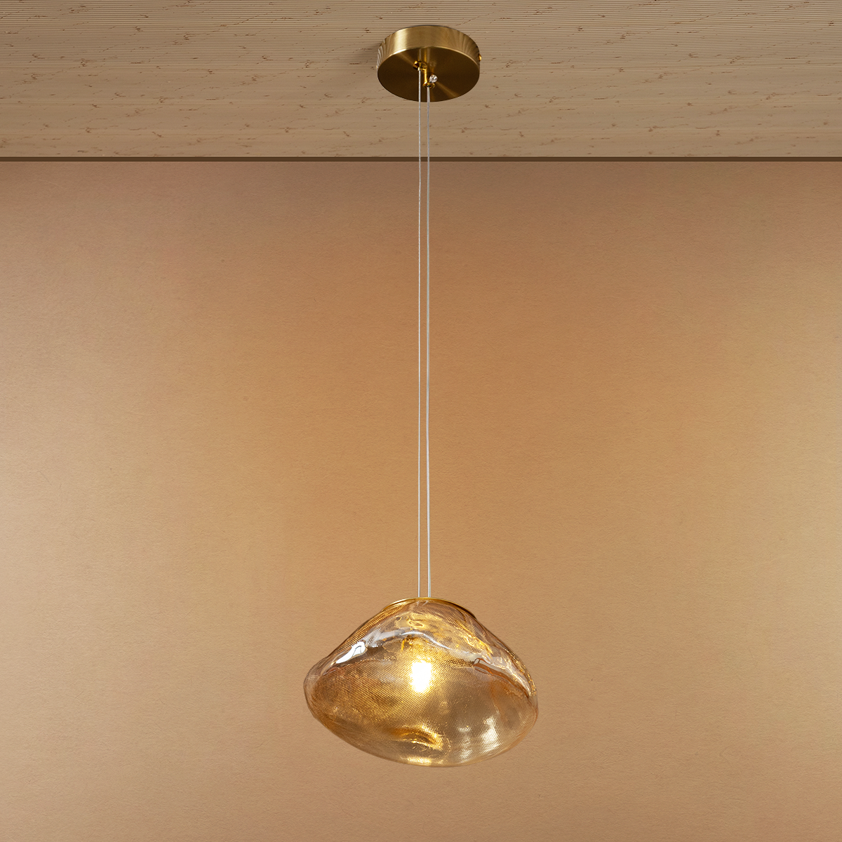 The Amber Drift Pendant Light is a perfect blend of art and illumination, inspired by the natural flow of molten glass. Its organically shaped amber-tinted glass shade creates a soft, warm glow that instantly elevates the ambiance of any space. Suspended from a sleek gold-finish canopy with adjustable wires, this piece brings a touch of modern luxury while maintaining a subtle, earthy charm.