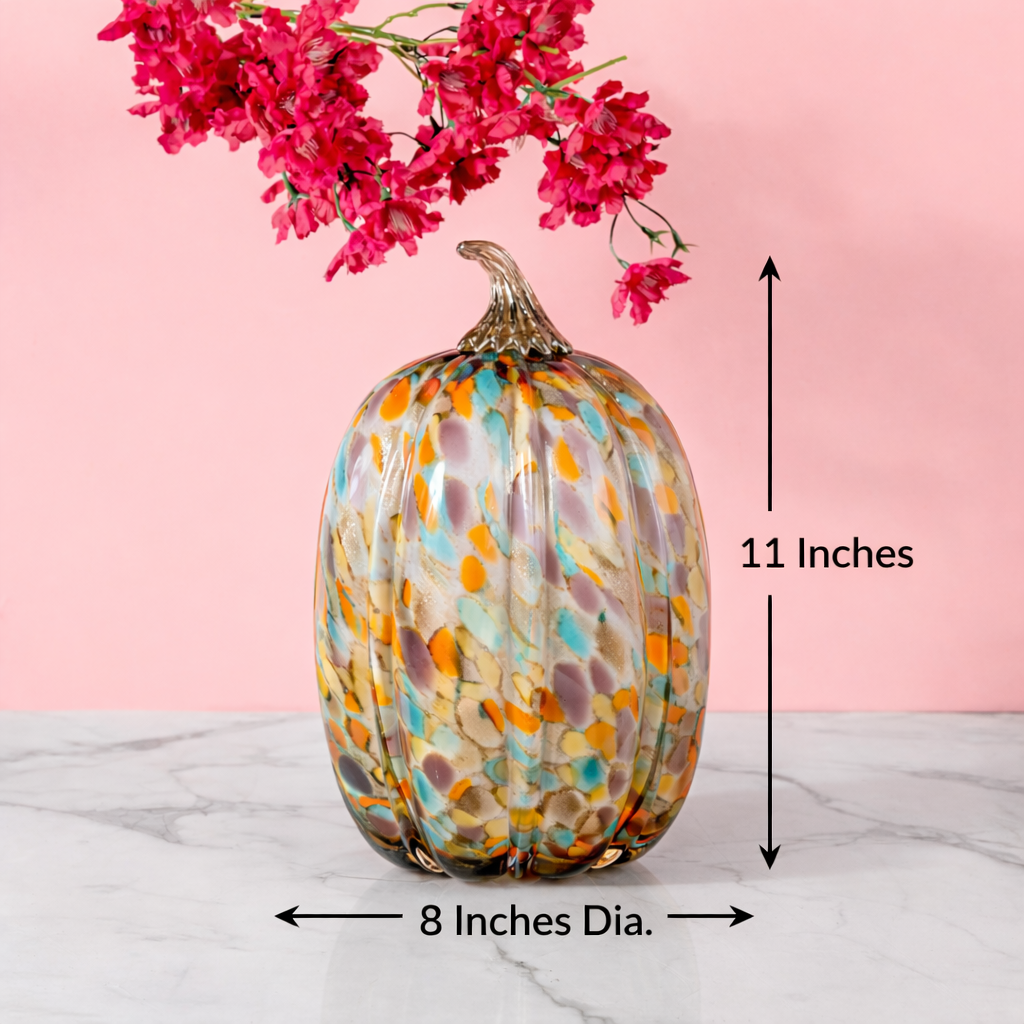 | This charming showpiece, handblown from glass, embodies the spirit of the harvest season with its pumpkin shape and warm, golden glow. Its intricately crafted details and vibrant colors make it a delightful addition to any tabletop or home decor, bringing a touch of autumnal charm to your living space. |
