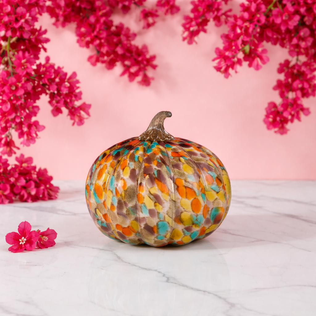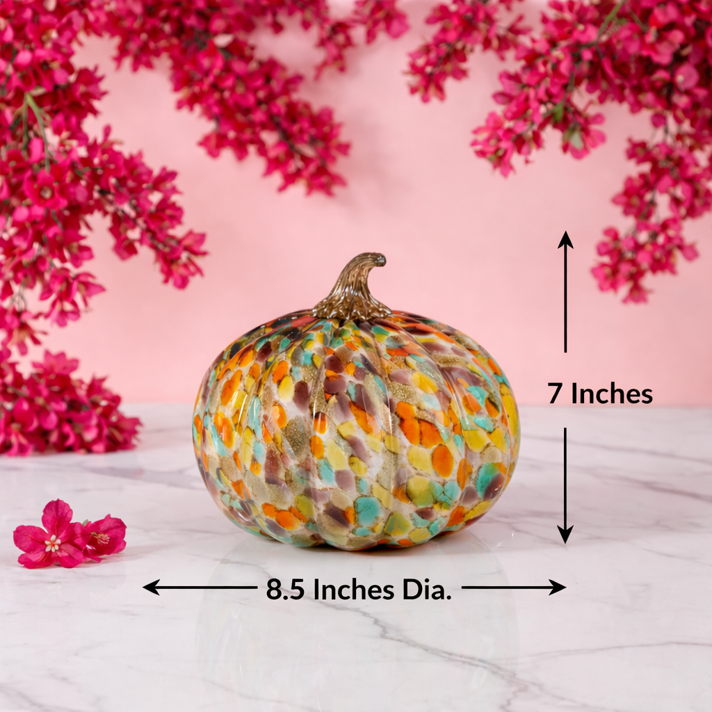 | This charming showpiece, handblown from glass, embodies the spirit of the harvest season with its pumpkin shape and warm, golden glow. Its intricately crafted details and vibrant colors make it a delightful addition to any tabletop or home decor, bringing a touch of autumnal charm to your living space. |