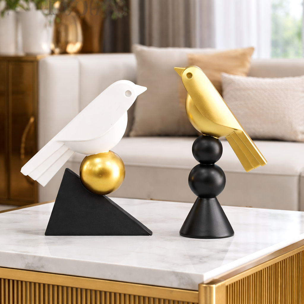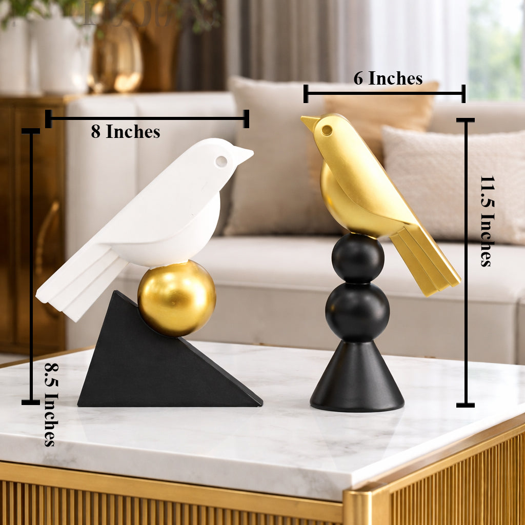 Elevate your home décor with this elegant set of two bird showpieces, crafted in a modern geometric design. One bird rests gracefully on a golden sphere, while the other perches on stacked black orbs, creating a unique balance of form and texture. With its minimalist style and premium finish, this set blends effortlessly with contemporary and luxury interiors.