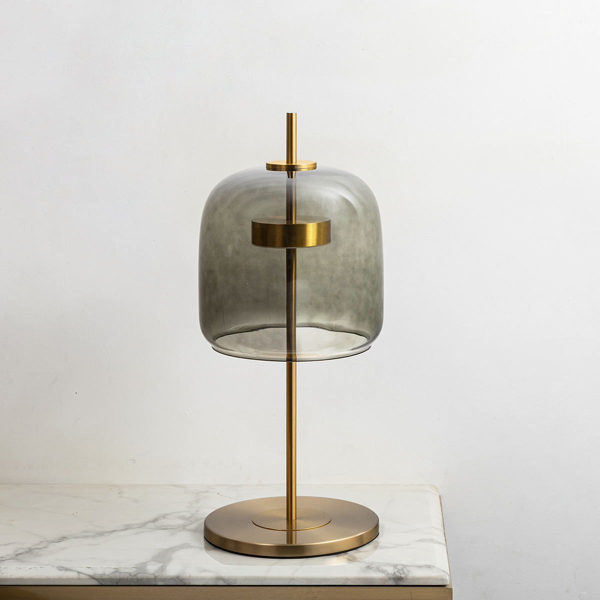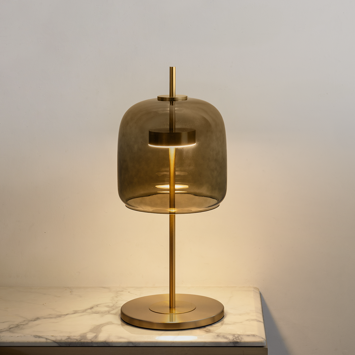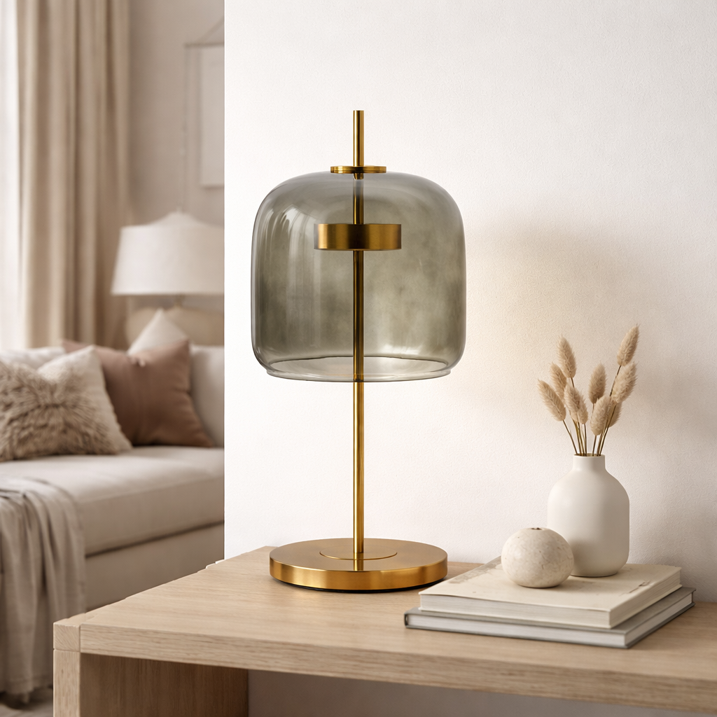A refined blend of sculptural form and ambient lighting, this table lamp features a smooth glass shade that softly diffuses light. Its sleek vertical structure and balanced base create a modern yet timeless presence, perfect for elevating bedside tables, consoles, or living spaces.