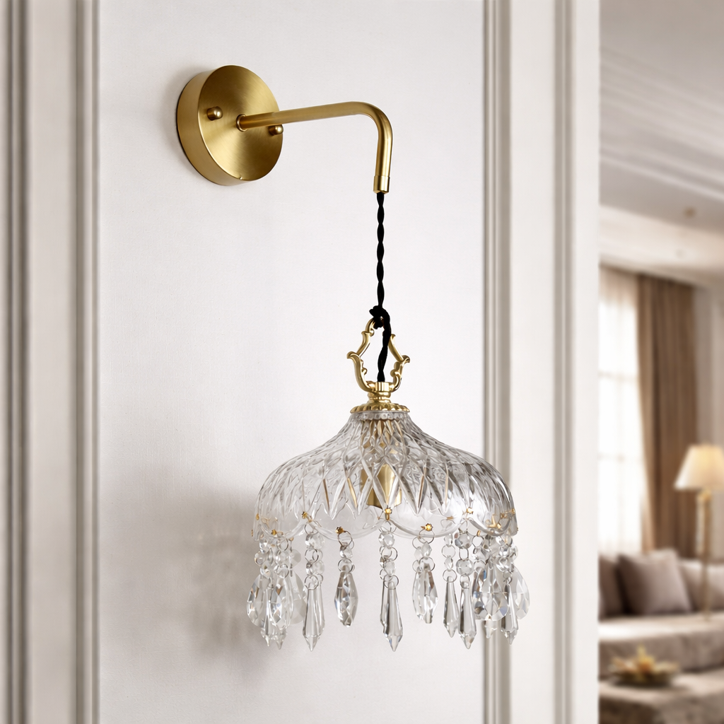 Enhance your space with a touch of refined elegance with this decorative wall light, featuring a gracefully suspended frame adorned with sparkling crystal accents. The intricate crystal details catch and reflect light beautifully, creating a soft, luxurious ambiance. Paired with a sleek extended arm and a refined metal base, this wall light makes a stunning addition to bedrooms, hallways, dressing areas, or beside mirrors, serving as both a practical light source and a sophisticated decorative piece.