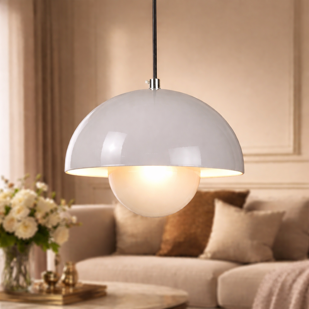 Bring a clean, contemporary touch to your interiors with this minimalist pendant light, featuring a smooth dome-shaped shade paired with a rounded inner element for a balanced, modern silhouette. The thoughtfully designed form provides soft, even illumination, making it ideal for both ambient and task lighting. Suspended from a sleek cord, it complements modern, Scandinavian, and contemporary spaces, perfect for dining areas, kitchen islands, or stylish living spaces.