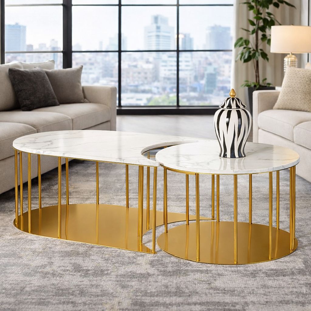 The Aristocrat Aura Coffee Table is an exquisite choice among home decoration items, designed to enhance any living room with its stunning aesthetics and practical functionality. This designer coffee table features a unique crescent-shaped base crafted from high-quality stainless steel, finished in a luxurious metallic gold that captures the eye and brightens the space. The table top, made of refined marble, offers a durable and elegant surface for hosting gatherings, displaying decor, or enjoying your morning coffee. The sleek curvature of the base paired with the pristine marble top allows this coffee table to serve as a central piece in modern and traditional settings alike, making it a versatile addition to any home. Its reflective gold base not only adds a touch of glamour but also complements the cool tones of the marble, creating a harmonious balance that is visually appealing. This product is only eligible for partial COD, which means that you will have to pay a 10% advance before the product is shipped and the balance 90% can be paid at the time of delivery. This is done as it is a high value product and if it is not accepted at delivery, the company faces a majour expense on packaging and 2 way shipping of the product. |