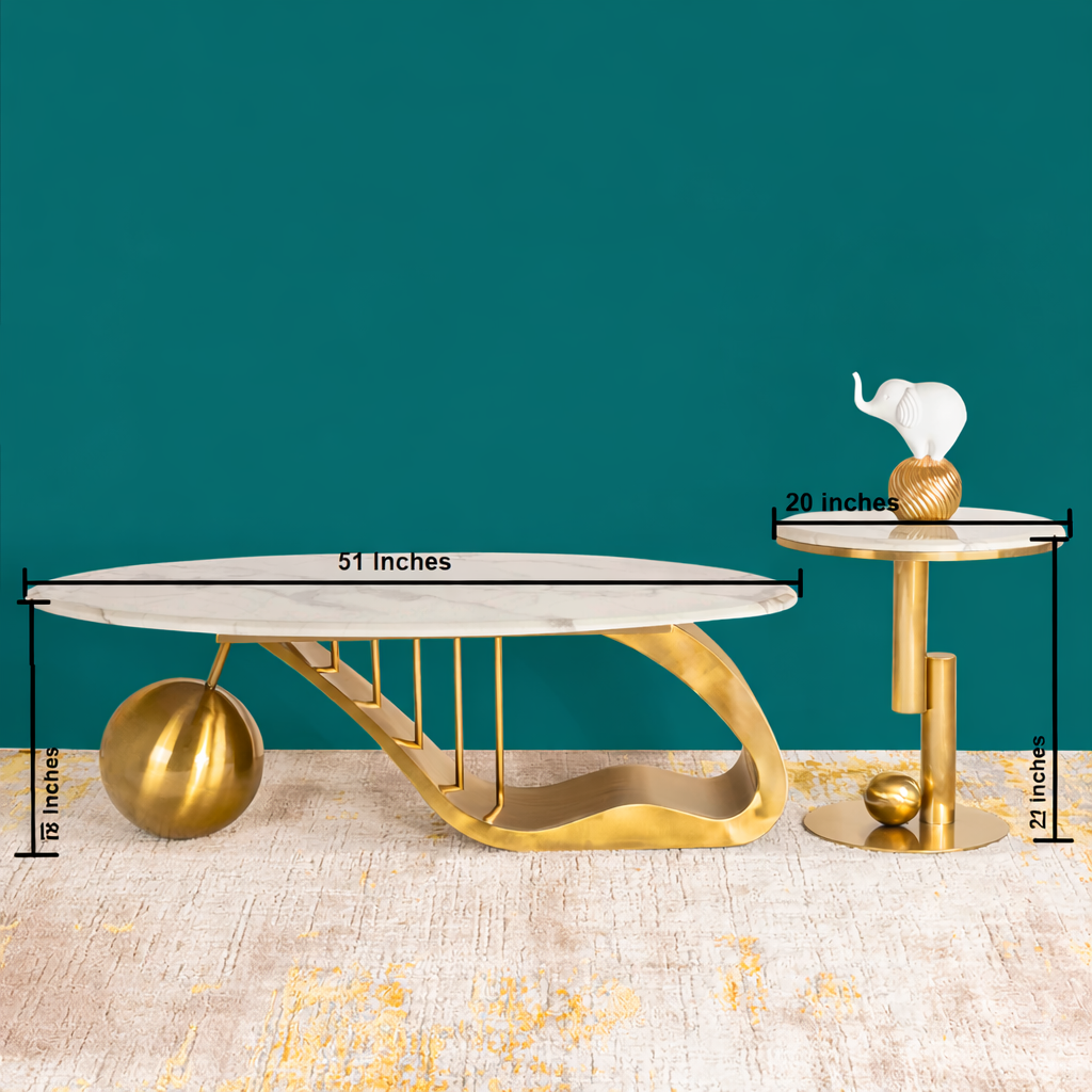 | The Golden Mesa Coffee Table is an embodiment of robust elegance and modern design, perfectly suited for enhancing the ambiance of any living room. This designer coffee table is meticulously crafted from the finest metal, finished in a rich golden hue that invokes the grandeur and stability of a mesa—a flat-topped hill with steep sides. This artistic approach to the table's base offers a sturdy foundation that is both visually striking and immensely practical. The table's golden base not only serves as a strong support but also adds a touch of opulence and luxury to the living space. The top of the table is a beautifully polished marble slab, known for its durability and timeless appeal. The natural veins and swirls in the marble top make each Golden Mesa Coffee Table unique, adding an exclusive element to your home decoration items. |