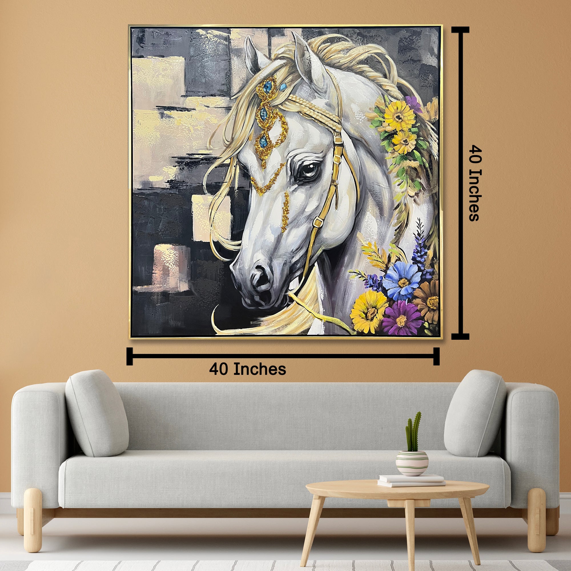 This wall painting for home features a royal horse surrounded by blooming flowers, a perfect home decor product. A stunning wall decoration item, its elegant design and vibrant colors enhance any living space. Ideal for items for home decoration, it brings a touch of regal beauty and nature to your interior. This piece transforms your room into an artistic sanctuary, blending modern abstract art with timeless charm. Perfect for those seeking to elevate their decor with a unique and graceful focal point.