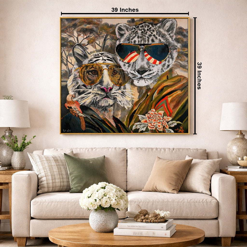 This vibrant painting showcases two anthropomorphized big cats—a regal white tiger and a sleek snow leopard—exuding effortless style. Both sport oversized aviator sunglasses (the tiger’s shades mirror its iconic stripes; the leopard’s feature bold red - and - white accents). Adorned in intricately embroidered attire (note the bold florals and striking geometric motifs), they pose against a dreamy, tree - filled backdrop that blends natural serenity with artistic boldness. A delicate bird perched near the tiger adds a whimsical touch.