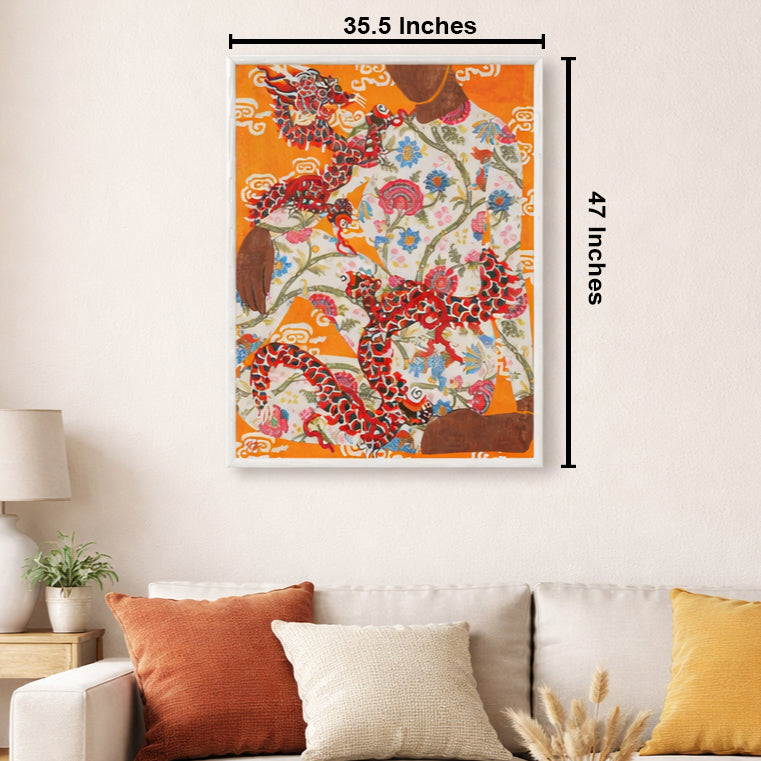 This captivating artwork merges East Asian cultural symbolism with bold, modern design. At its heart, dynamic red-and-blue dragons—emblems of power, prosperity, and good fortune in Chinese lore—intertwine across a canvas inspired by traditional garment textiles. Intricate floral patterns (think peonies, chrysanthemums, and other symbolic blooms) bloom in vivid pinks, blues, and greens, evoking the richness of heritage fabrics. A warm orange backdrop, dotted with stylized clouds, ties the composition together, creating a sense of movement and ethereal energy.