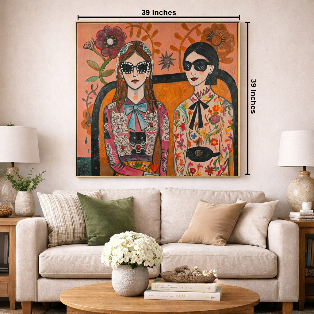 This eye - catching decorative painting features two fashionable figures set against a vivid backdrop of oversized blooms and stylized foliage. The left figure wears a pink outfit decorated with bold tiger and leopard prints, complemented by a light - blue bow, while the right figure showcases a floral - patterned ensemble with a classic black bow and a recognizable Gucci belt. The warm - hued background, filled with striking flowers, star - shaped details, and artistic vines, merges retro style, playful animal imagery, and dreamy floral artistry. It brings a lively, eclectic charm to any space, perfect for those who appreciate unique, fashion - forward decor with an artistic twist.