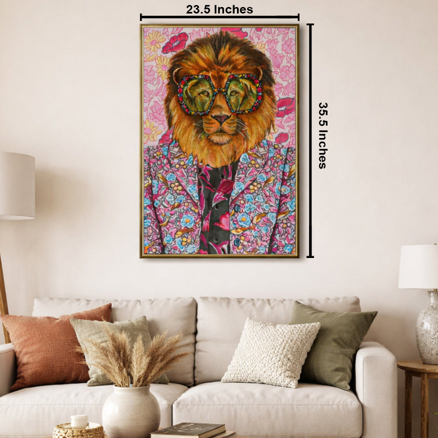 This eye - catching decorative painting showcases a majestic lion sporting oversized, rhinestone - encrusted sunglasses that exude luxury. The lion is dressed in a vibrant, floral - patterned blazer layered over a dark shirt, set against a background bursting with colorful blooms and playful lip motifs. With its bold color palette, whimsical yet retro - chic aesthetic, this artwork infuses spaces with personality, sophistication, and a dash of playful glamour—perfect for those who crave unique, statement - making home decor.