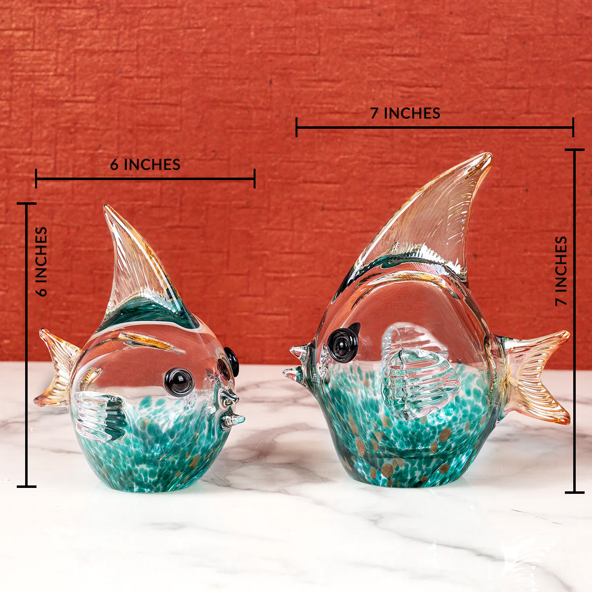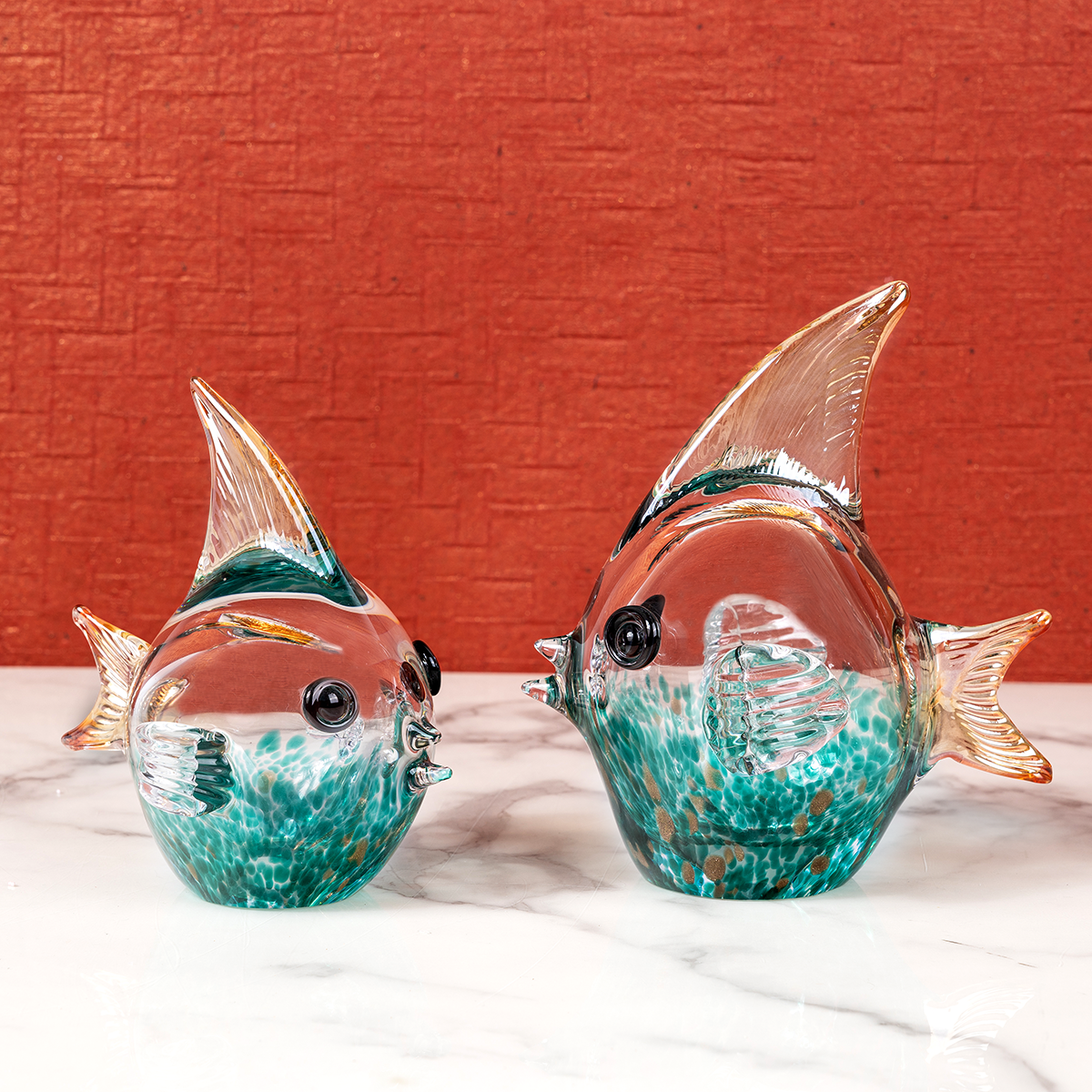 This hand-blown glass showpiece beautifully captures the fluidity and grace of aquatic life. Crafted in the shape of a sleek fish, its delicate lines mimic the movement of fins and tail, creating an enchanting visual melody reminiscent of an underwater symphony. |