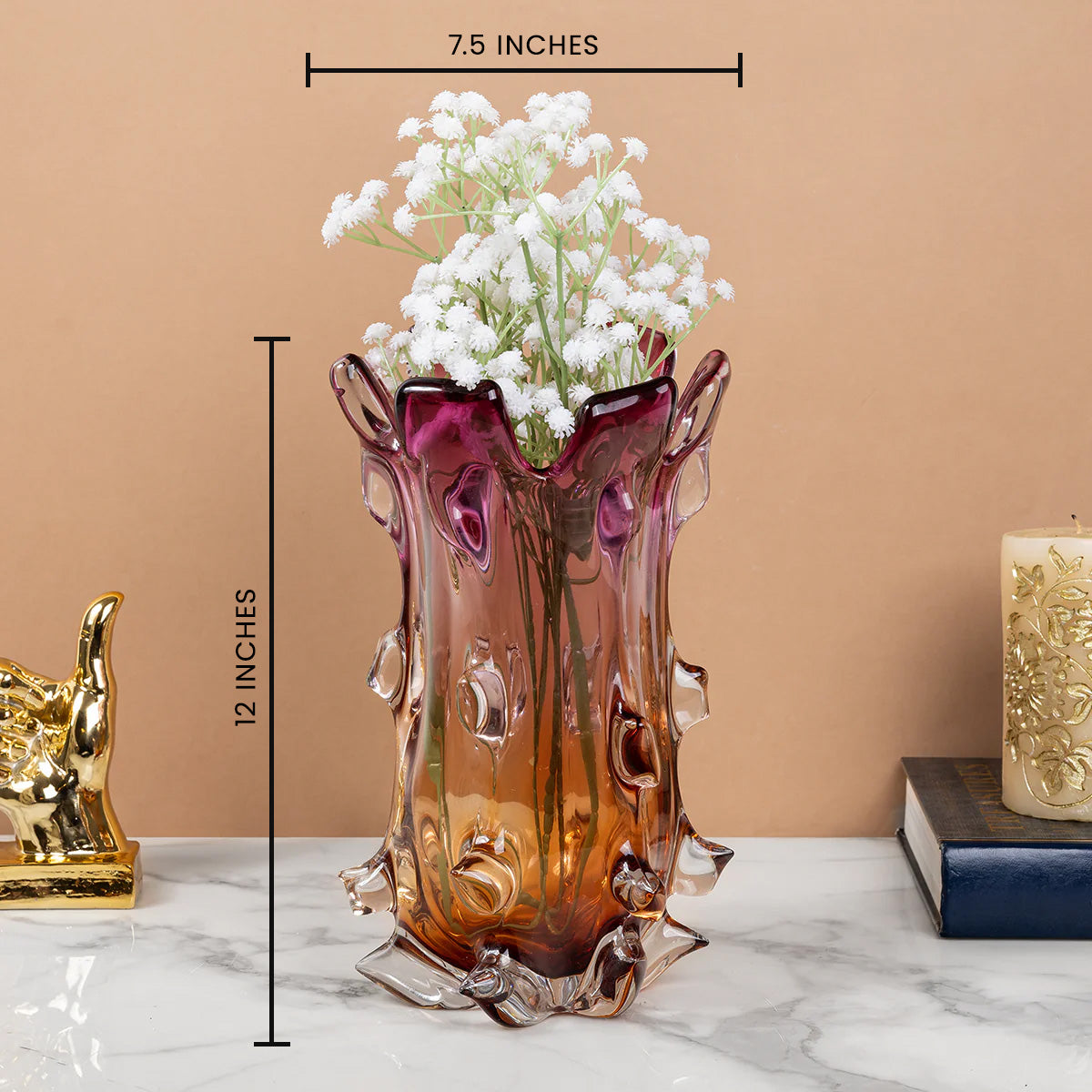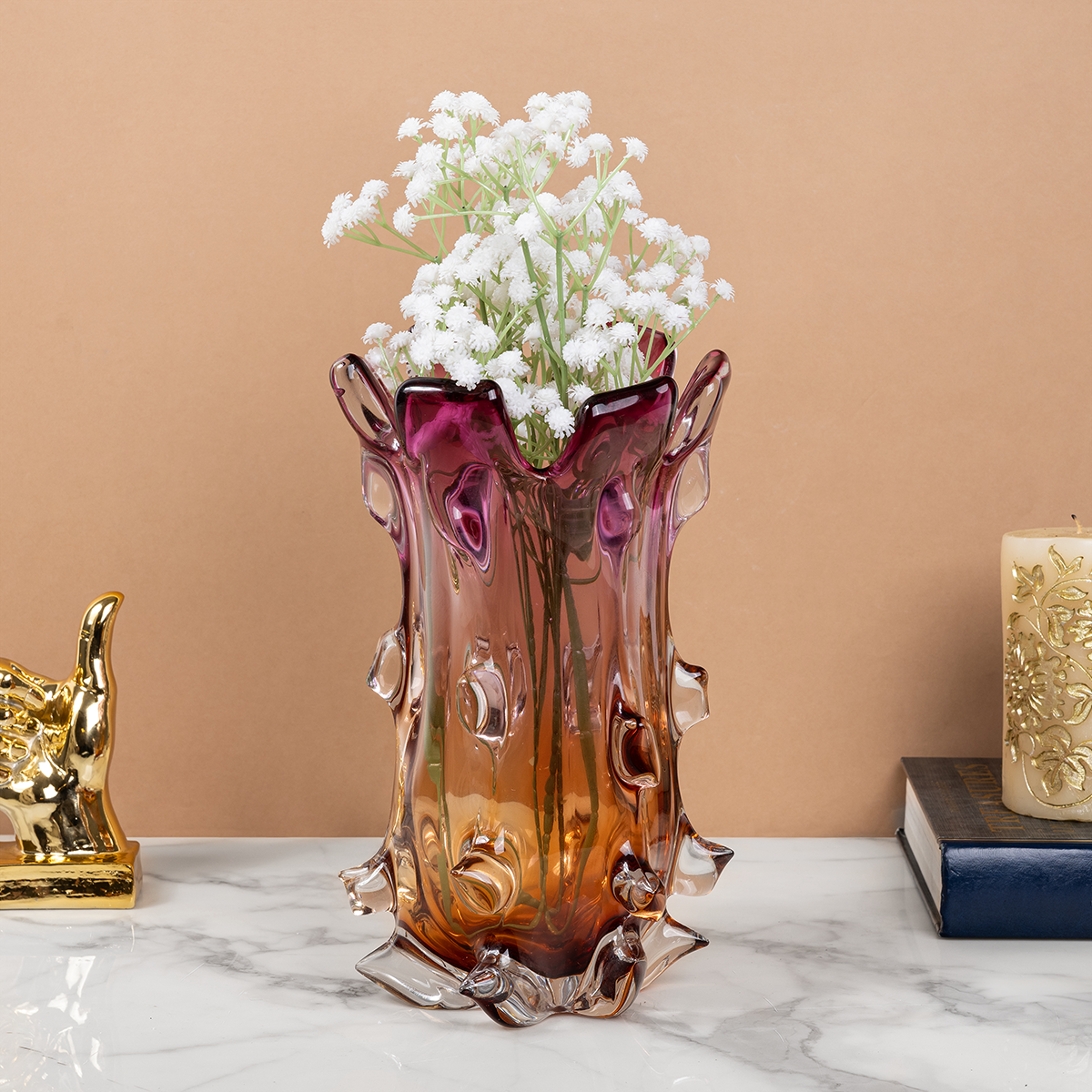 Delicately crafted from handblown glass, this vase boasts a soft pink hue resembling the blush of a blooming flower. Its graceful curves and translucent quality make it a charming accent piece for tabletops or home decor, adding a touch of romance and elegance to your living space. |