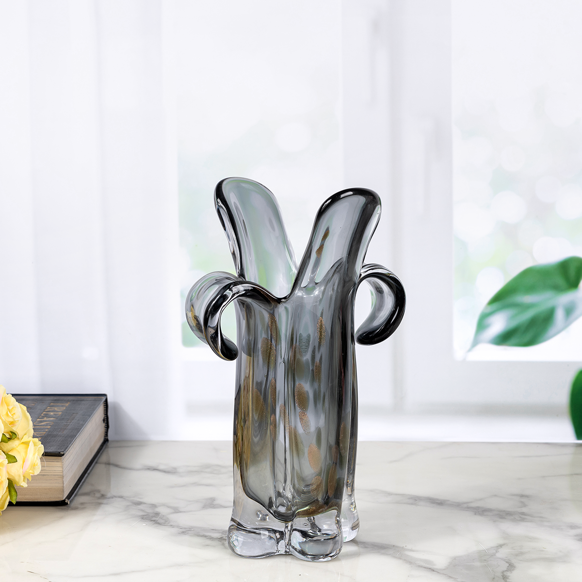 Crafted with swirling patterns reminiscent of the night sky, this handblown glass vase adds a touch of celestial beauty to your home. Its ethereal design and sparkling finish make it a mesmerizing centerpiece. |