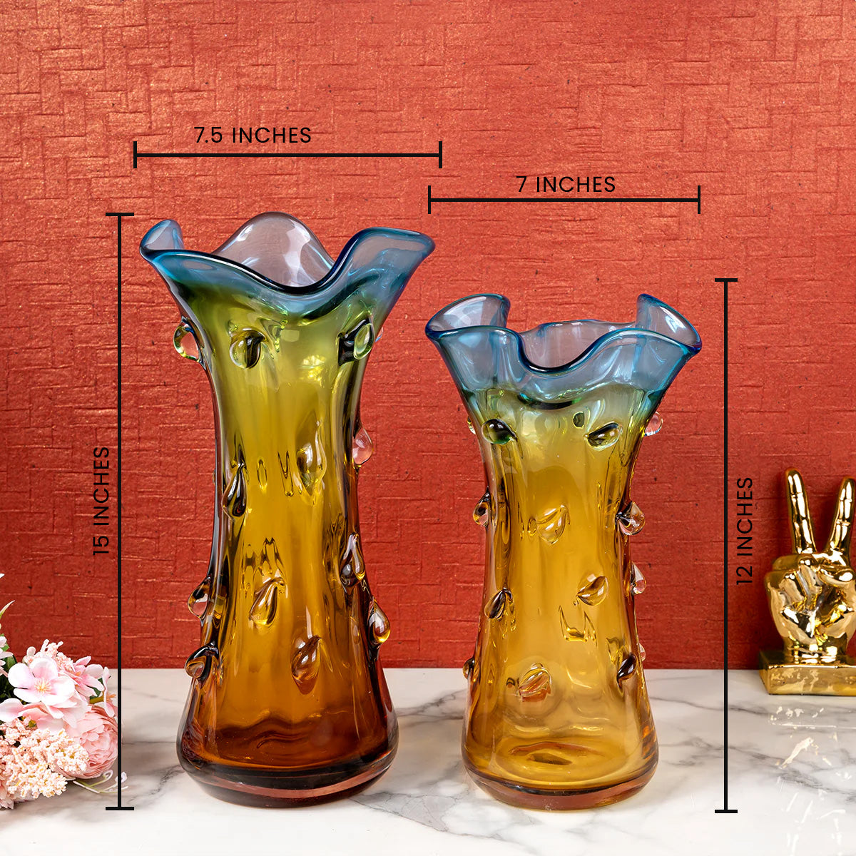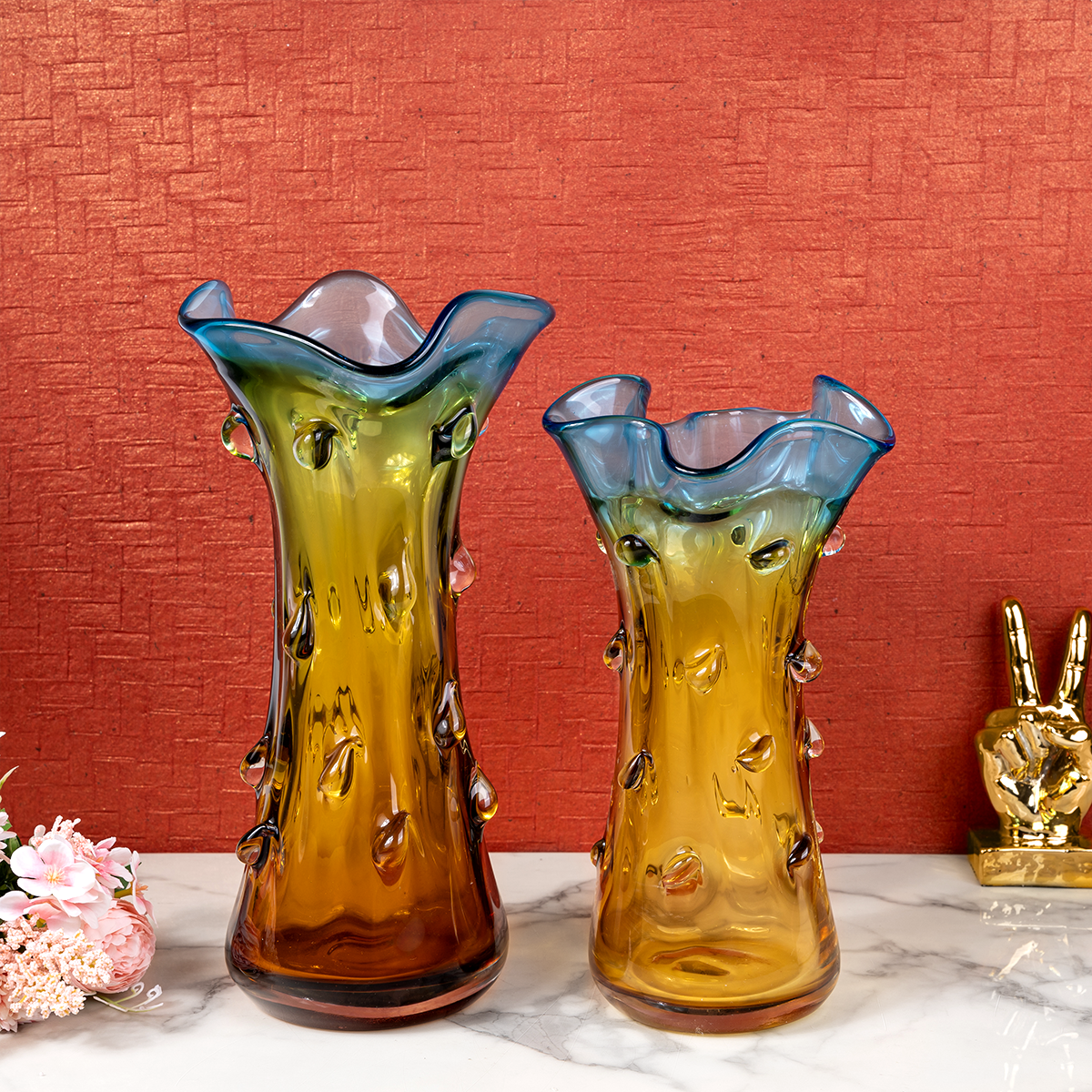 Like tranquil waters reflecting the sky, this handblown glass vase exudes serenity and calm. Its soothing blue tones and fluid design create a peaceful atmosphere, perfect for any room in your home. |