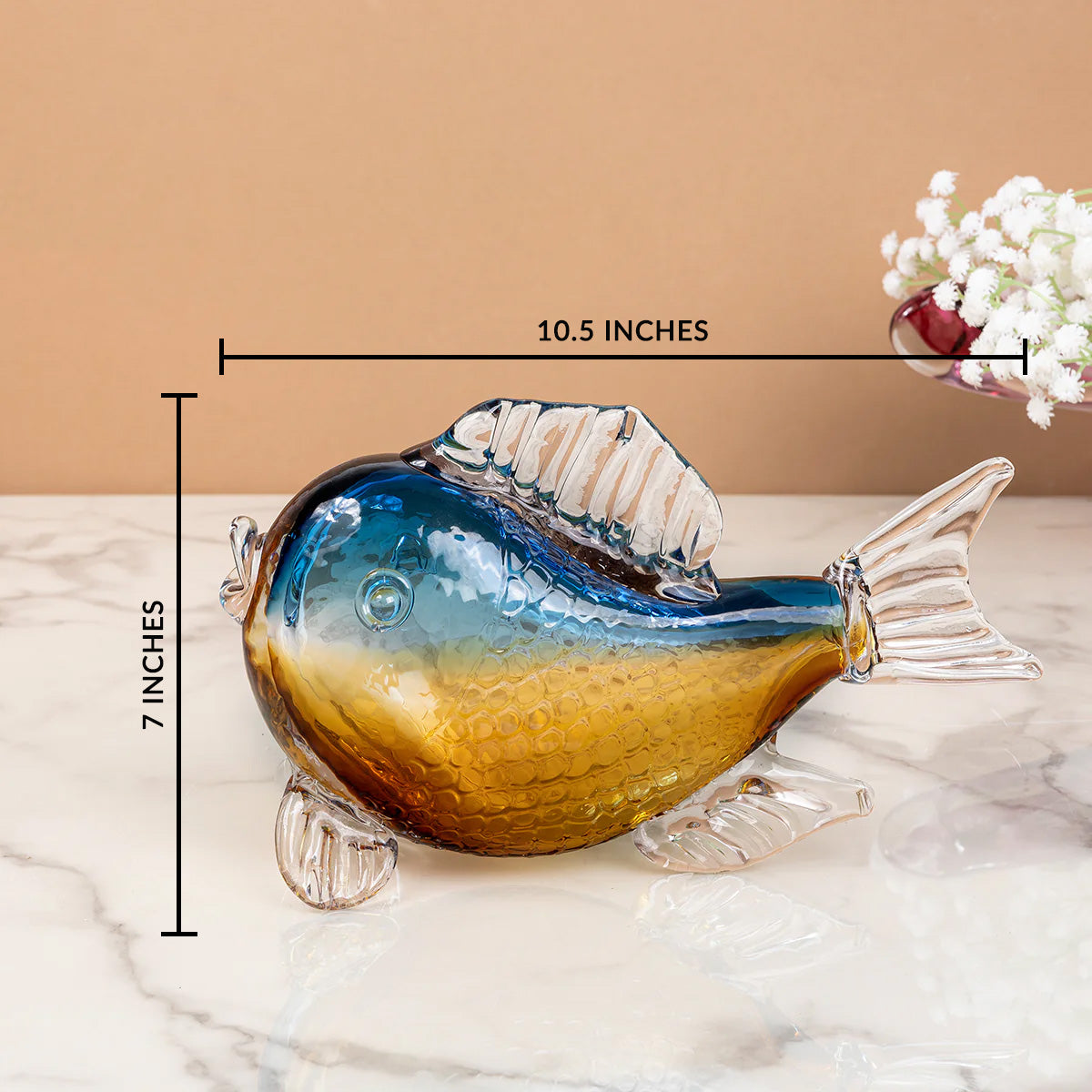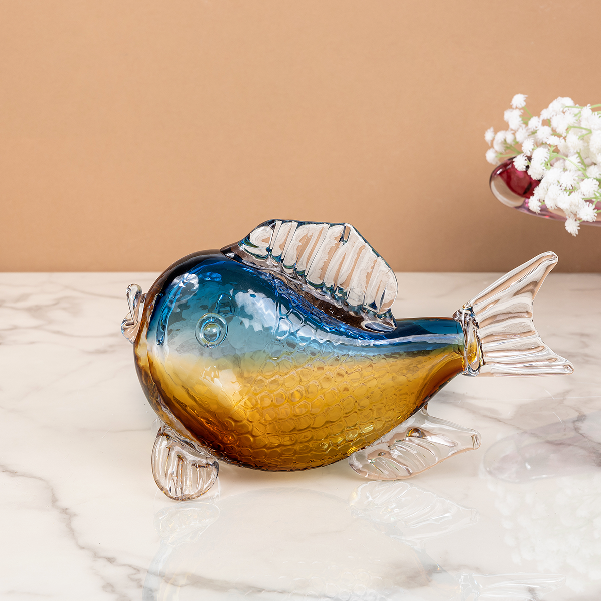 Indulge your senses with the serene beauty of this handblown glass fish sculpture, a stunning representation of the tranquil allure of the ocean. As a decorative showpiece, it exudes a sense of seaside serenity, making it an ideal addition to any space in need of a calming touch. Its artisanal craftsmanship and serene aesthetic make it a timeless treasure for discerning decorators, each intricately sculpted detail capturing the essence of marine life with breathtaking precision. Whether displayed on a side table, shelf, or windowsill, this exquisite sculpture serves as a gentle reminder of the soothing rhythms of the sea, infusing your home with a sense of peace and tranquility that transcends time. |