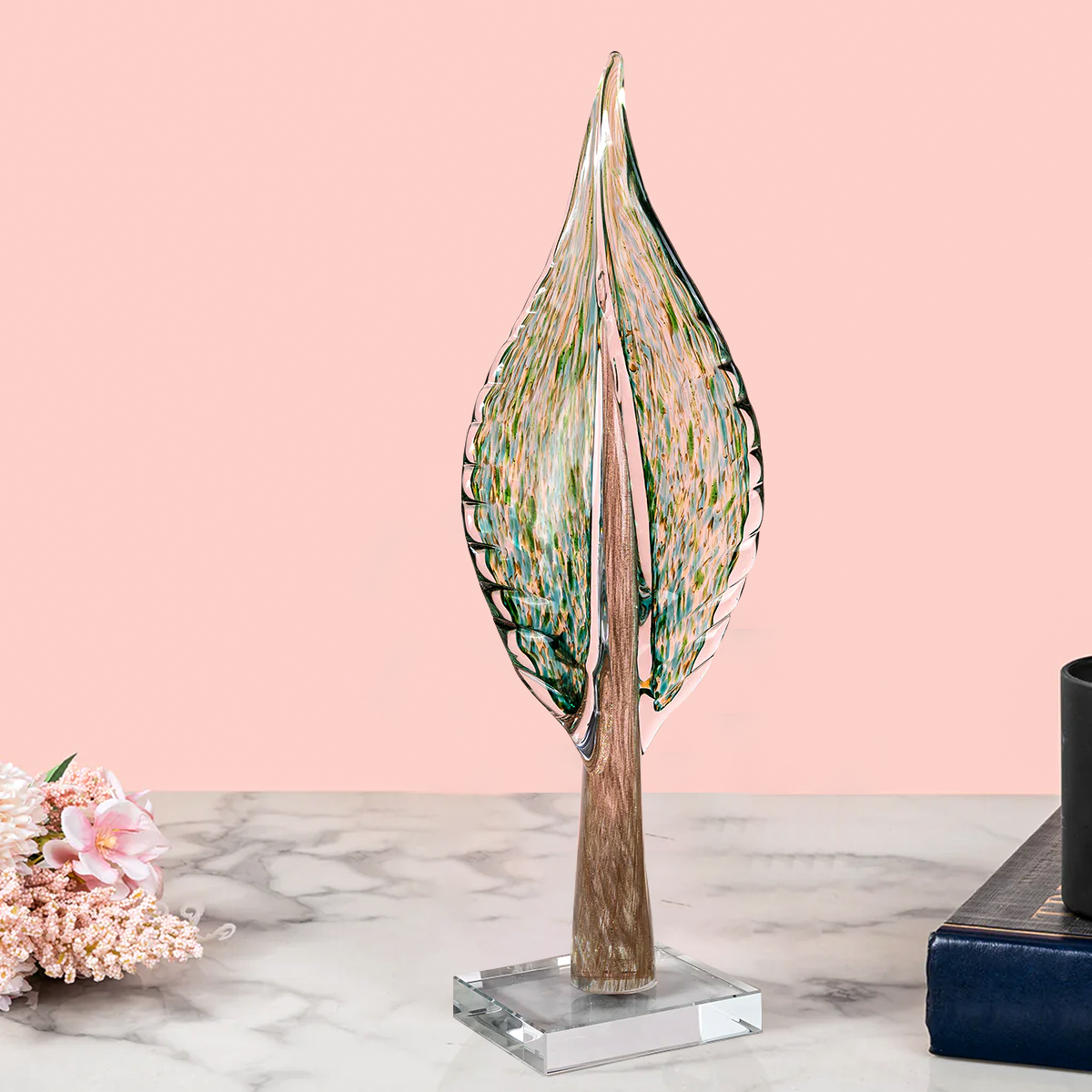 This exquisite showpiece, meticulously handblown from glass, captures the beauty of nature with its lifelike leaf shape and lush green hue. Its graceful curves and delicate veins add a touch of organic elegance to any tabletop or home decor, bringing the refreshing essence of a verdant oasis into your living space. |