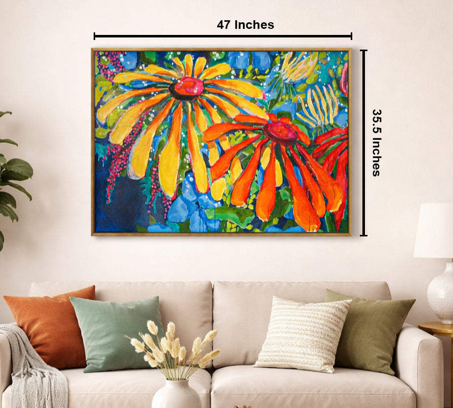 This captivating artwork bursts with color and vitality! It showcases large, expressive floral forms—evocative of sunflowers or coneflowers—in vivid hues of yellow, orange, and red. These radiant blooms stand out against a lively backdrop of blues, greens, and playful fuchsia accents. Bold brushstrokes and a dynamic composition infuse the piece with energy, bringing the untamed joy of nature’s beauty into any space. Whether gracing a living room, bedroom, or office, this painting adds a splash of warmth, creativity, and artistic exuberance to your decor.