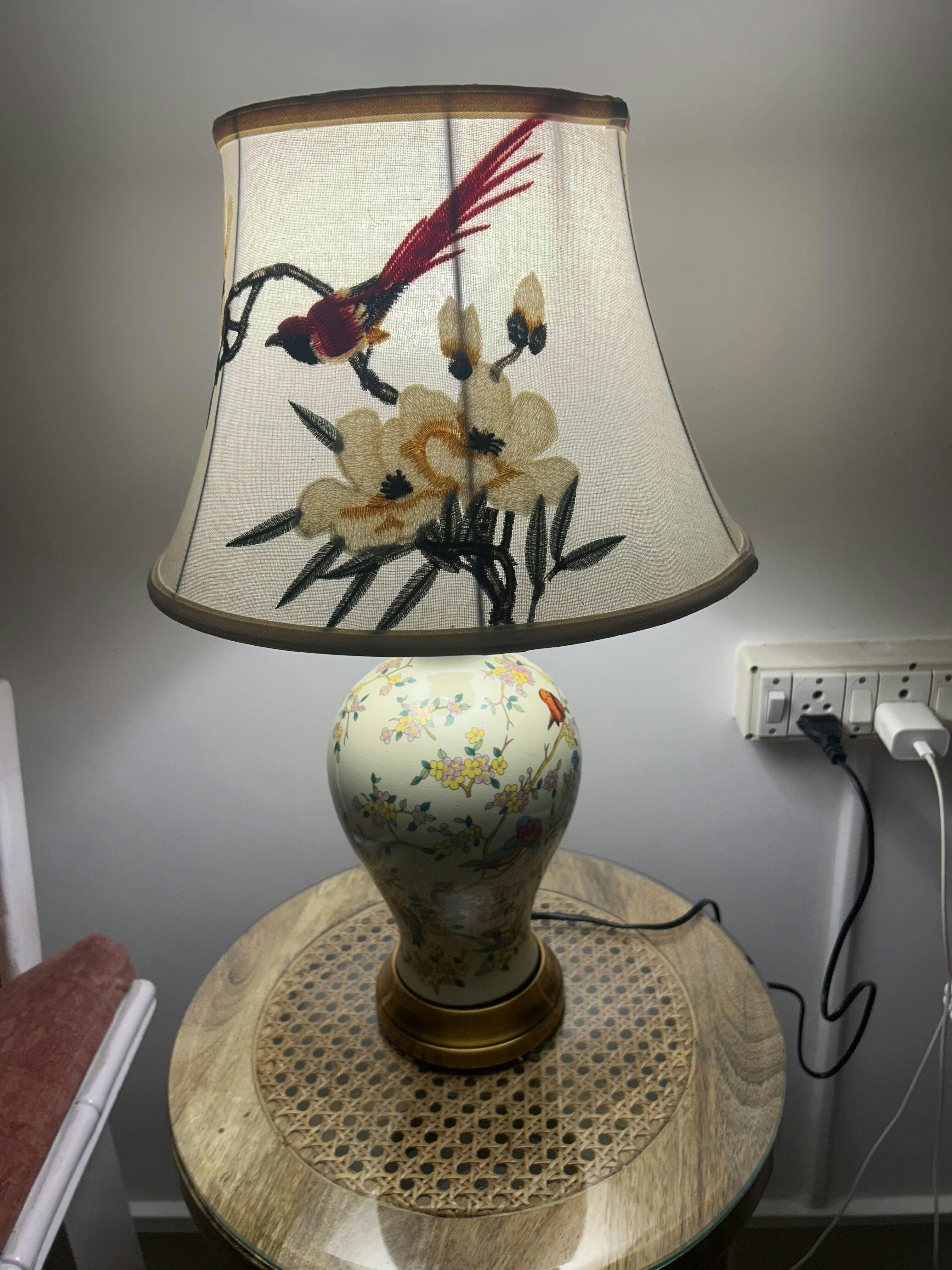The Serene Garden Table Lamp is a beautiful addition to any collection of home decoration items. Featuring a ceramic base adorned with delicate floral and bird designs, this lamp brings a touch of natural beauty into your home. The fabric lampshade, in a classic bell shape, diffuses light softly, creating a warm and inviting glow perfect for any room. Whether used as a bedside lamp, living room accent, or desk light, the Serene Garden Table Lamp complements your space beautifully. Its timeless design ensures it fits seamlessly into various interior styles, from traditional to contemporary, making it a versatile table decor item. This lamp not only provides excellent lighting but also serves as a stylish and elegant focal point in your decor. With its combination of aesthetic appeal and practical use, the Serene Garden Table Lamp is a must-have for anyone looking to elevate their items for room decoration with a piece that is both beautiful and functional.