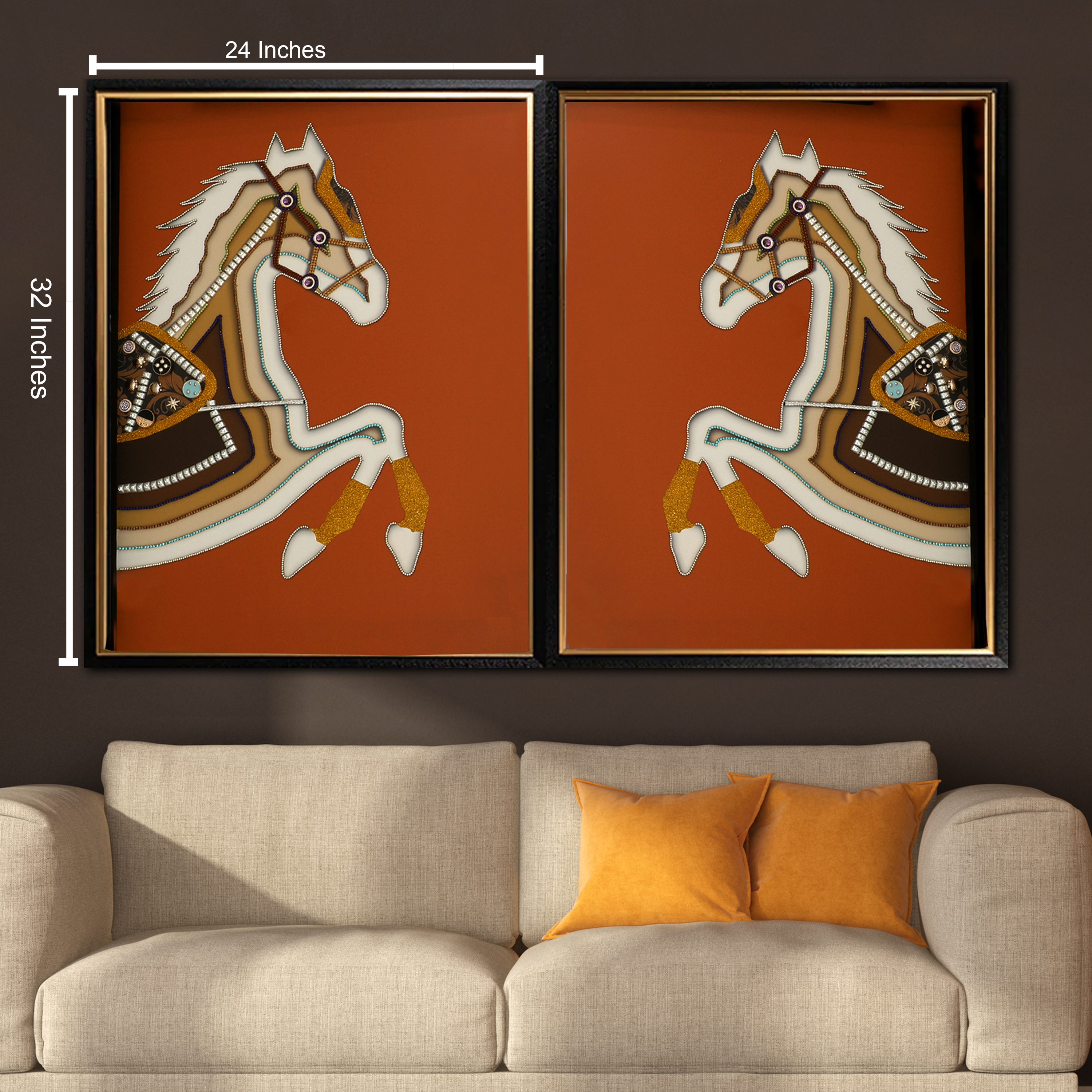 The Tranquil Trot Wall Decoration Shadow Box adds a bold and sophisticated touch to your home with its dynamic depiction of horses in motion. This designer wall painting features a pair of beautifully crafted horse designs, making it a standout home decoration item. The rich color palette and striking composition create a powerful focal point, perfect for your living room, hallway, or study. Ideal as a wall painting for home, this piece adds a sense of movement and energy, while also providing a timeless elegance that enhances both modern and classic interiors. Let the "Regal Equine Wall Art" transform your walls into a statement of refined style and power.