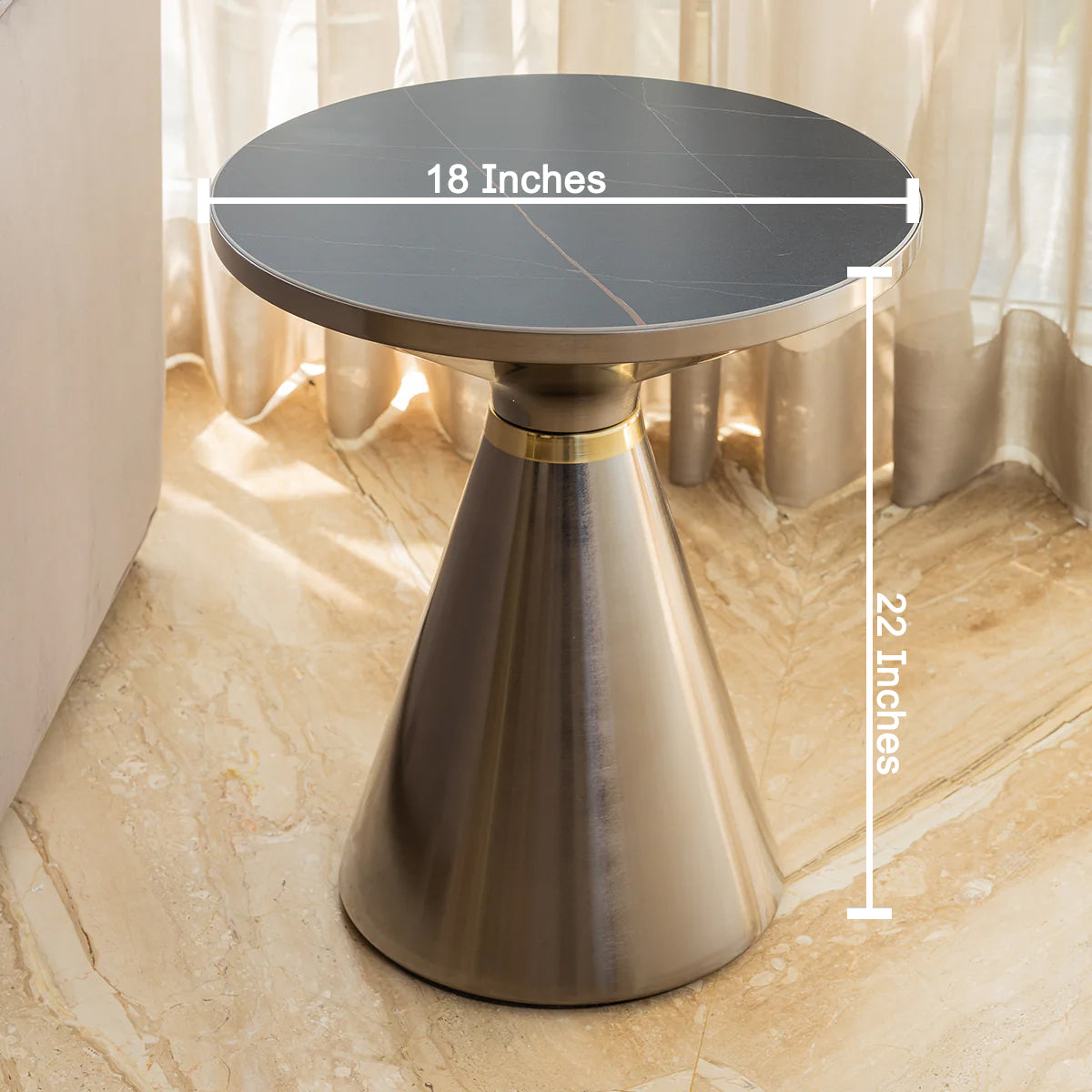 Elevate your interior with the Noir Elegance Side Table, a sophisticated addition to your collection of home decor products that exudes modern luxury. Crafted with a polished stainless steel base in a sleek silver finish, accented with a subtle gold band, and topped with a glossy imported marble surface featuring dramatic black veining, this side table for home is a perfect blend of style and functionality. Its elegant hourglass design makes it an ideal bedside table, offering a stylish space for your lamp, books, or a glass of water, while also serving as a striking item for home decoration. The table’s bold black top and reflective base create a stunning contrast, enhancing any room with a touch of contemporary elegance, from a modern bedroom to a chic living area.