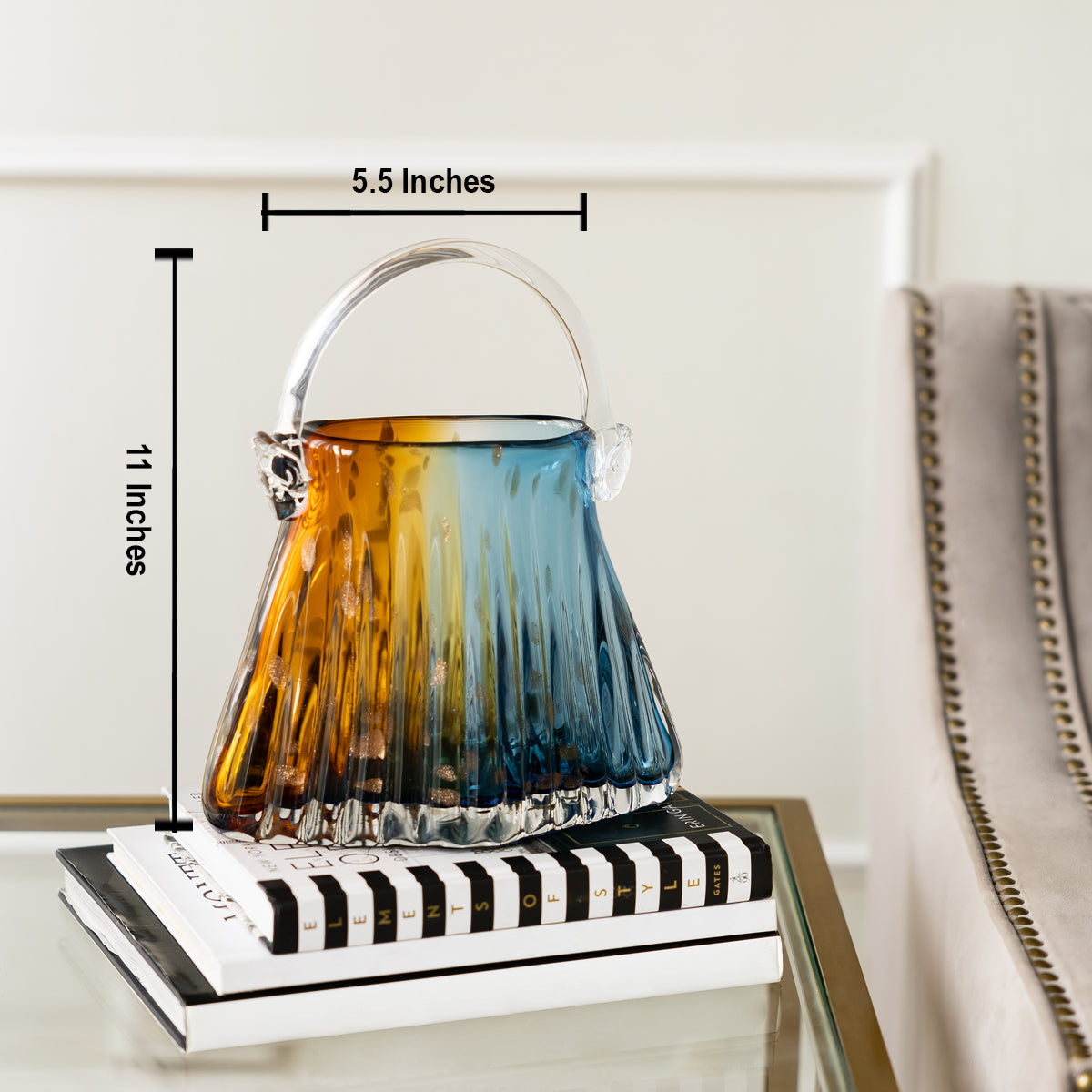 | This decorative showpiece, handblown from glass, mimics the shape of a stylish handbag with a delightful blend of yellow and blue hues reminiscent of coastal charm. Its sleek design and glossy finish make it a captivating addition to any tabletop or home decor, infusing your living space with a touch of seaside elegance and sophistication |