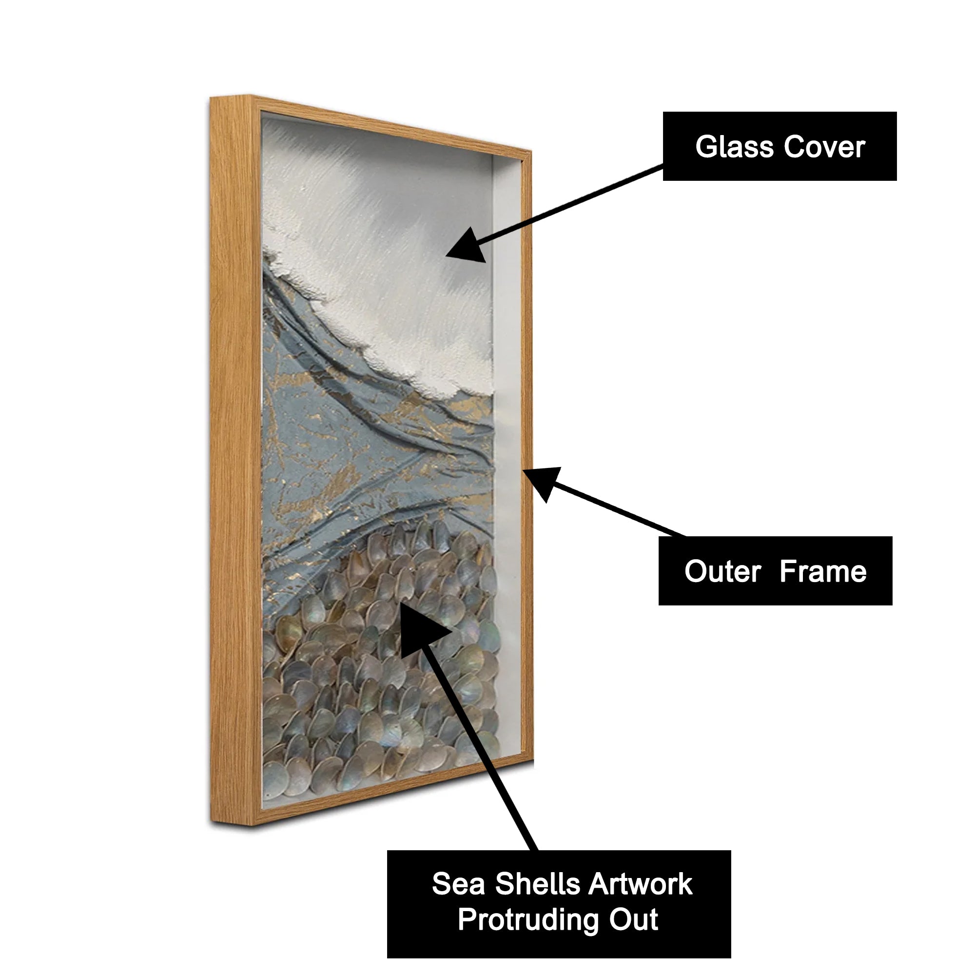 Brighten your decor with this shadow box, highlighted by protruding golden accents and white pebbles for a unique 3D appeal. A beautiful Decorative Wall Painting for Home, this Home Decor Product radiates coastal elegance. Perfect as a room Decoration item, it serves as a distinctive Items for Home Decoration. This Wall Decor piece adds a flowing, luxurious vibe to any interior. Ideal for a stylish theme, its protruding elements create a focal point, enhancing your home with a blend of beauty and serene sophistication.