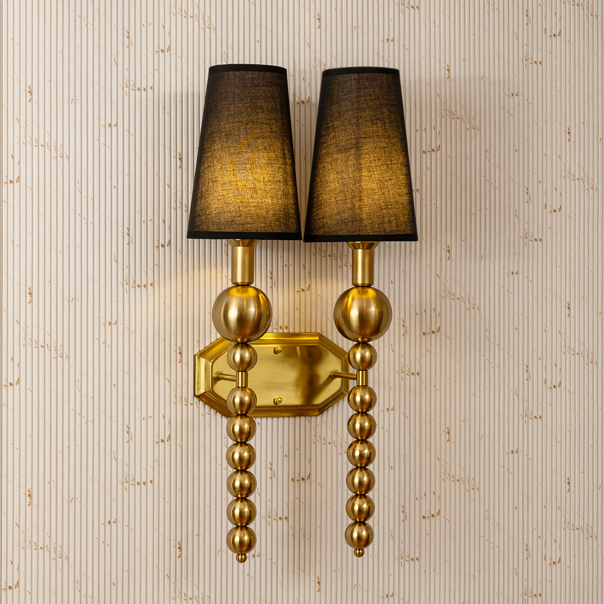 This striking dual wall light is a bold expression of luxury and refined design, perfect for elevating sophisticated interiors. Featuring two elegantly tapered dark shades, it casts a warm, ambient glow that creates an intimate and inviting atmosphere. The structured backplate anchors the design beautifully, while the sculptural detailing beneath each shade adds depth and dramatic visual interest. Its symmetrical layout enhances balance and makes it ideal for statement walls in bedrooms, living rooms, hallways, or upscale hospitality settings. The rich finish and layered silhouette bring a sense of grandeur without overwhelming the space. Designed to serve as both a functional lighting solution and a decorative focal point, this wall fixture delivers timeless elegance with a contemporary edge.