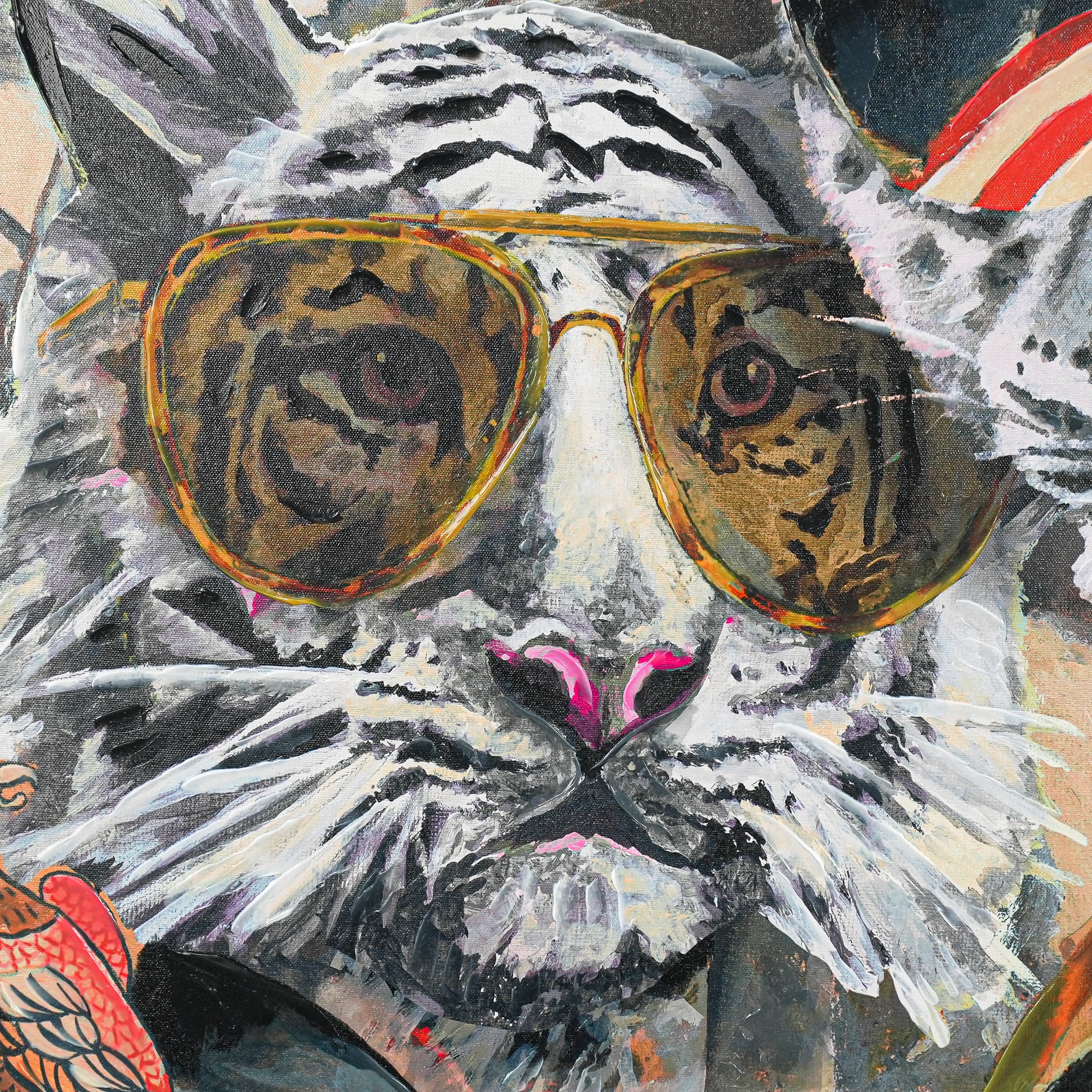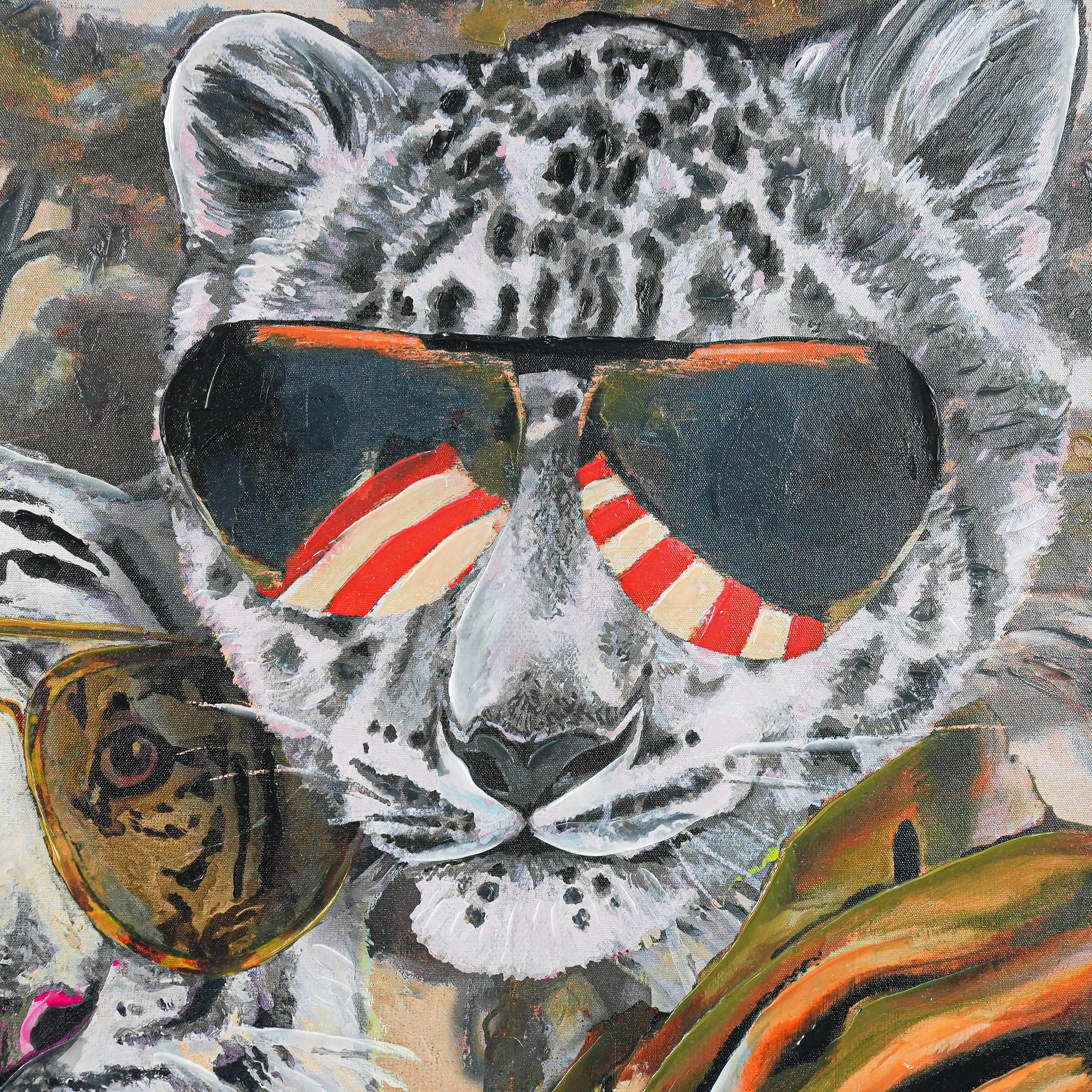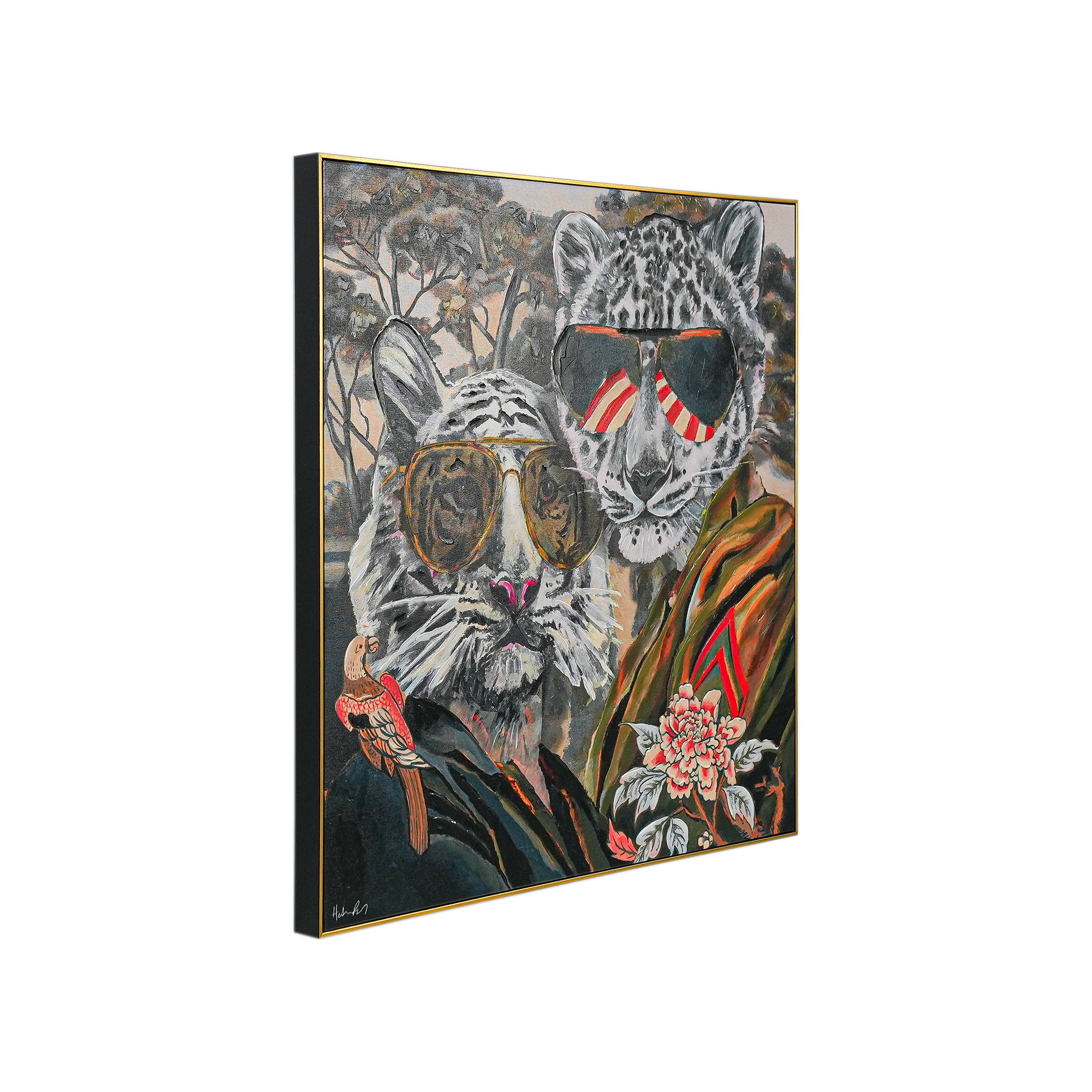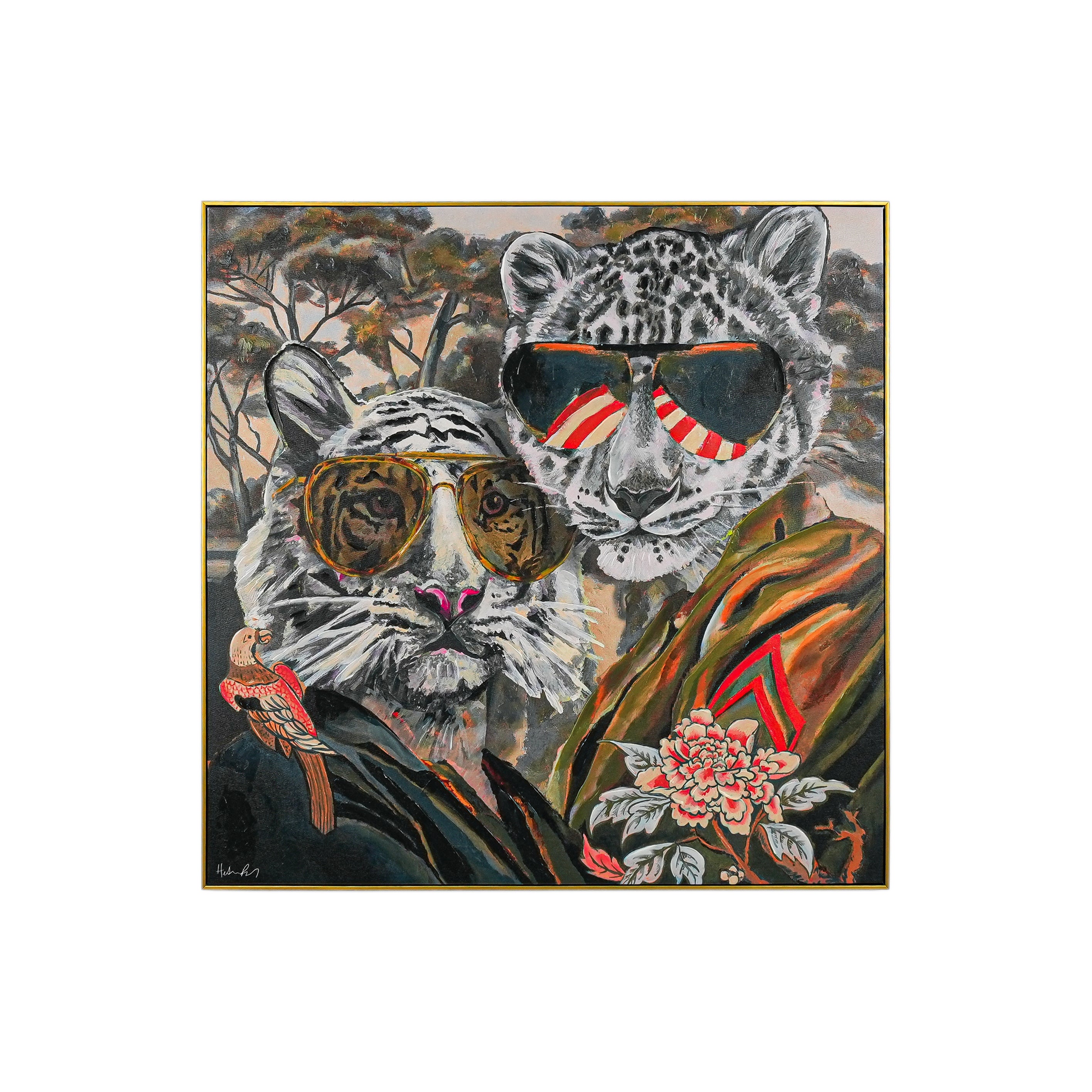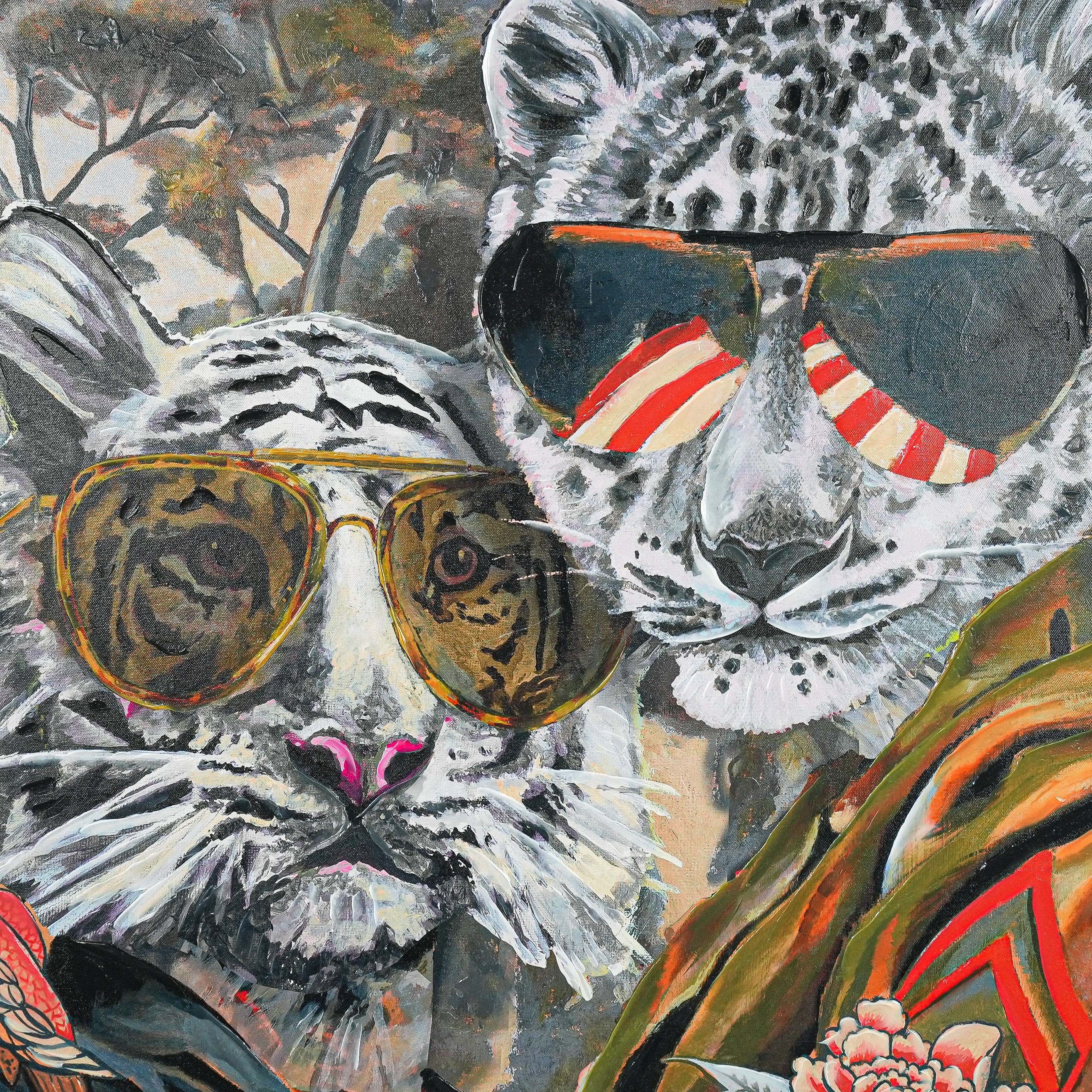 This vibrant painting showcases two anthropomorphized big cats—a regal white tiger and a sleek snow leopard—exuding effortless style. Both sport oversized aviator sunglasses (the tiger’s shades mirror its iconic stripes; the leopard’s feature bold red - and - white accents). Adorned in intricately embroidered attire (note the bold florals and striking geometric motifs), they pose against a dreamy, tree - filled backdrop that blends natural serenity with artistic boldness. A delicate bird perched near the tiger adds a whimsical touch.