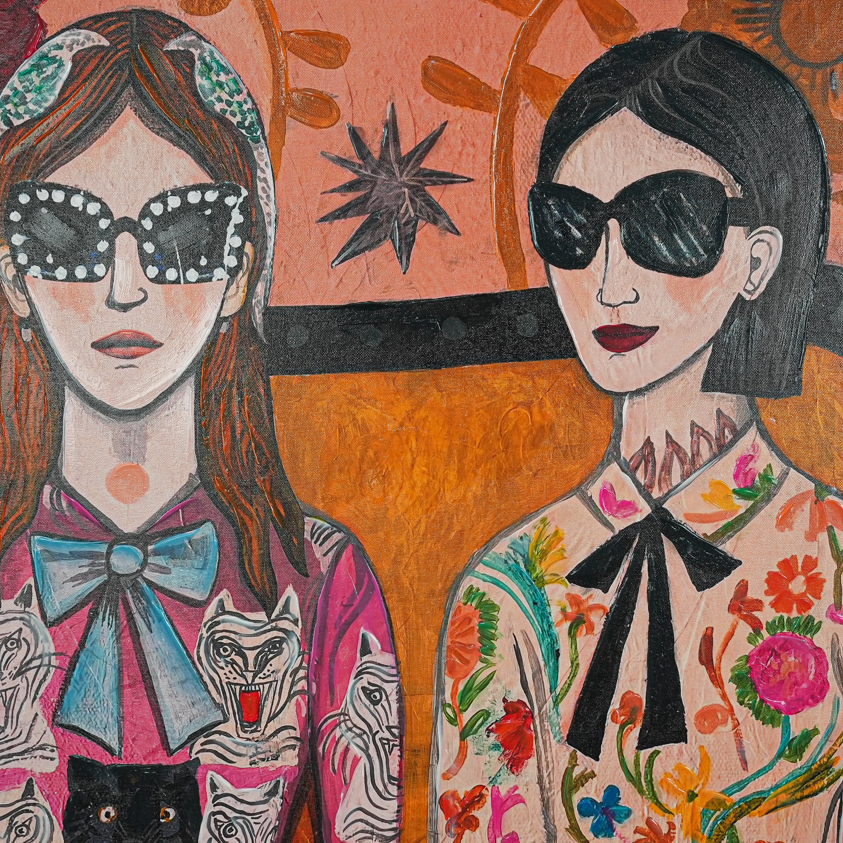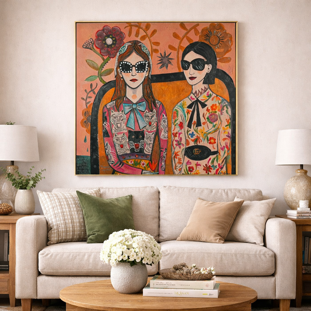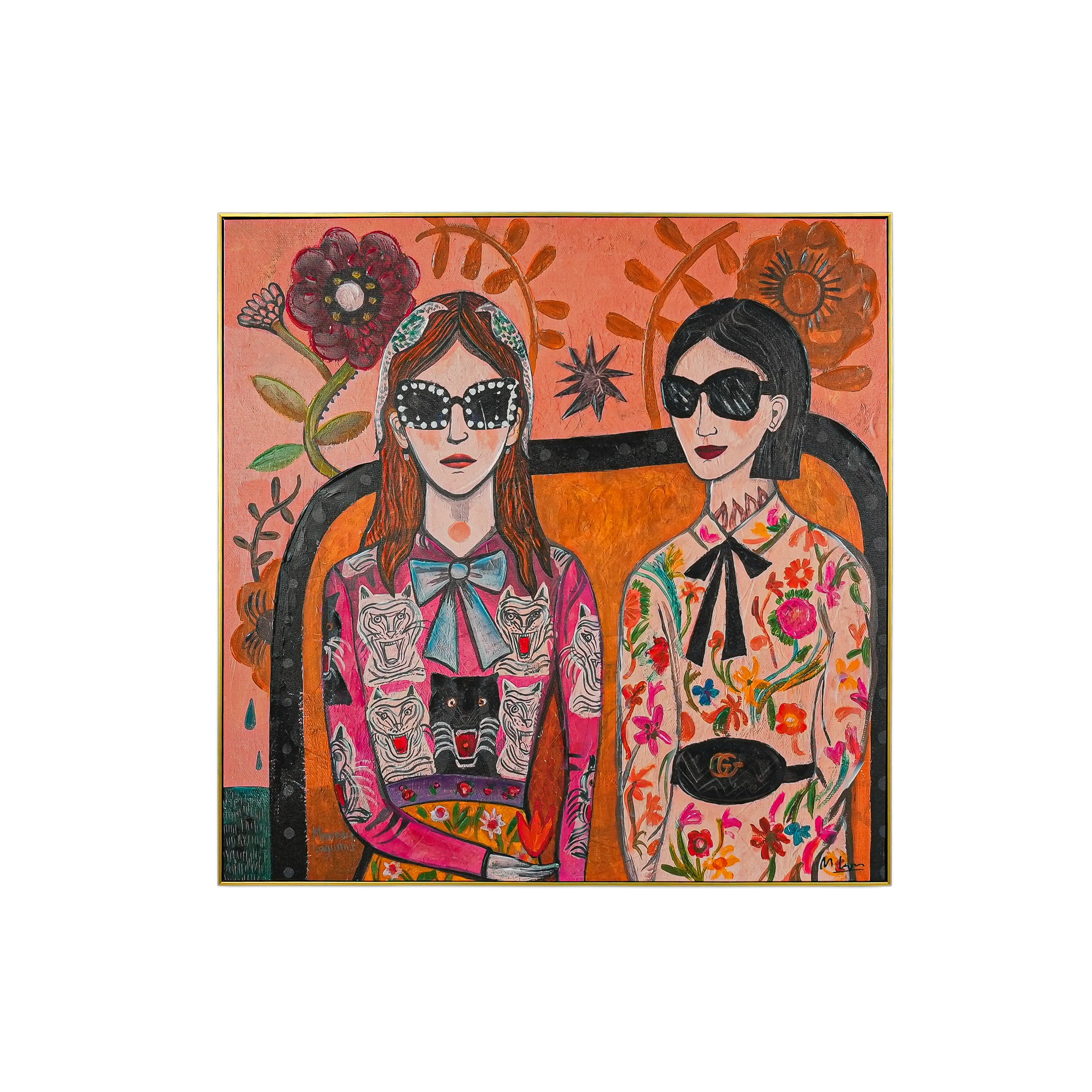 This eye - catching decorative painting features two fashionable figures set against a vivid backdrop of oversized blooms and stylized foliage. The left figure wears a pink outfit decorated with bold tiger and leopard prints, complemented by a light - blue bow, while the right figure showcases a floral - patterned ensemble with a classic black bow and a recognizable Gucci belt. The warm - hued background, filled with striking flowers, star - shaped details, and artistic vines, merges retro style, playful animal imagery, and dreamy floral artistry. It brings a lively, eclectic charm to any space, perfect for those who appreciate unique, fashion - forward decor with an artistic twist.