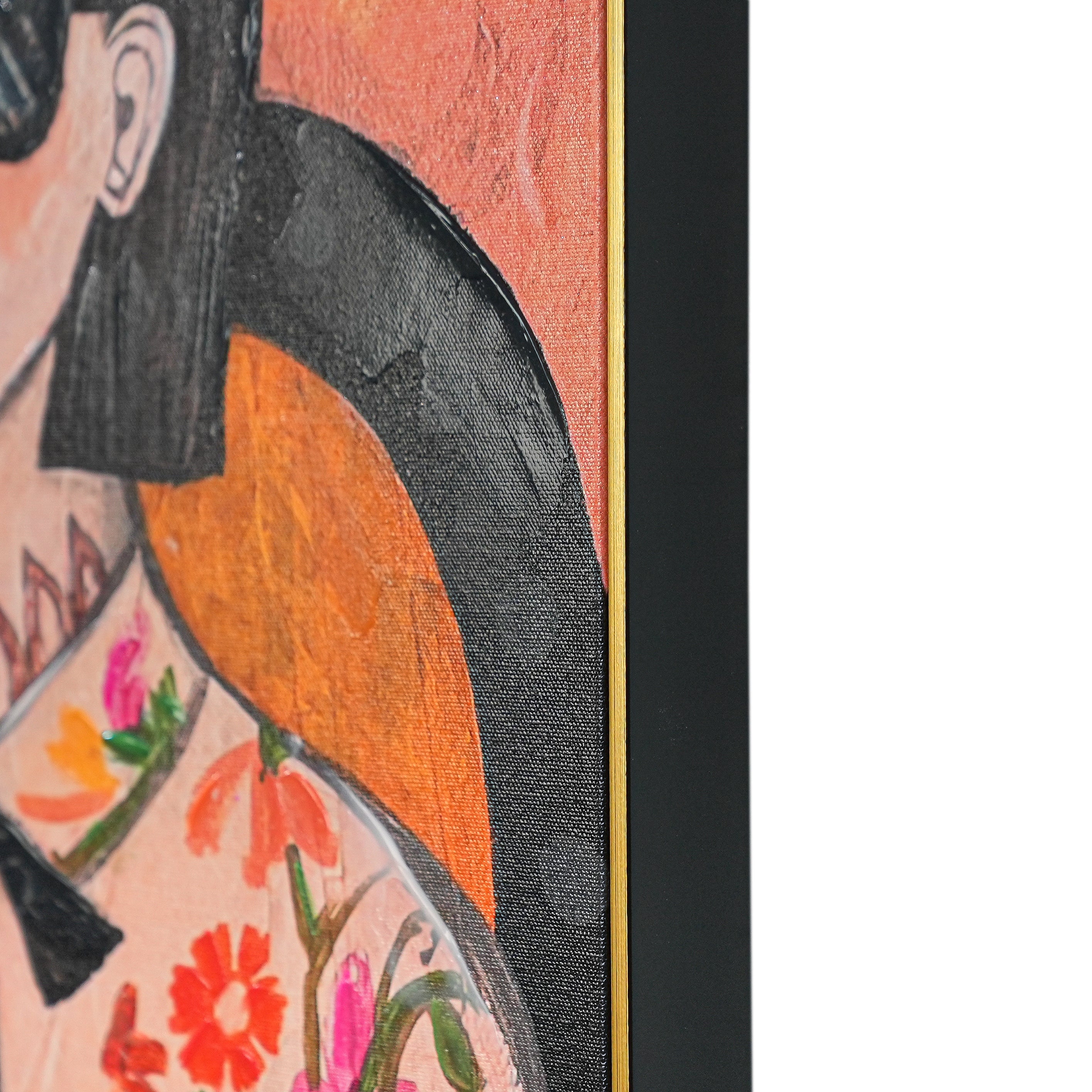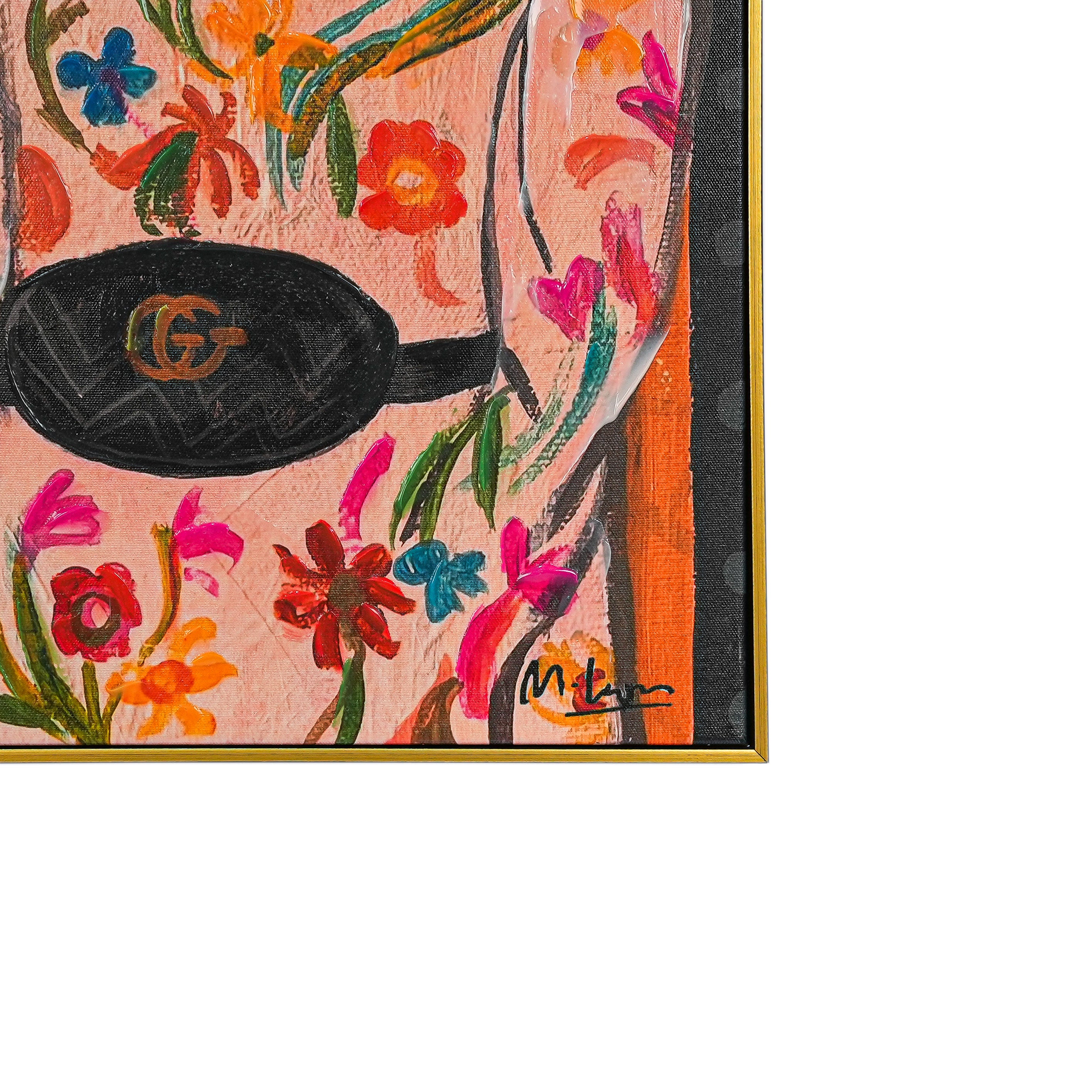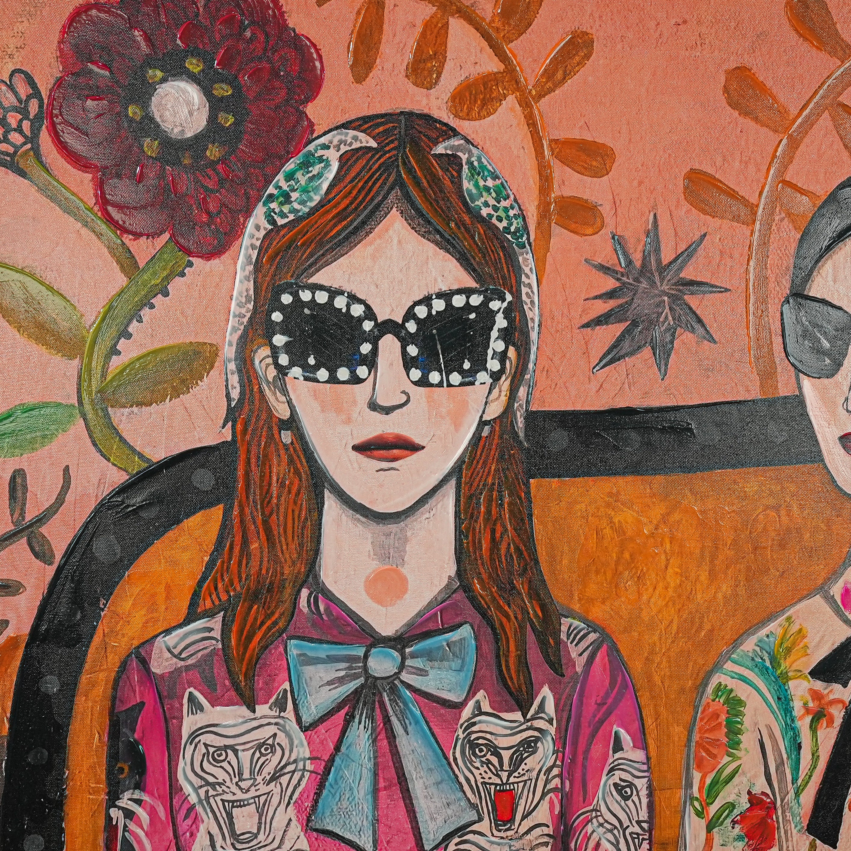 This eye - catching decorative painting features two fashionable figures set against a vivid backdrop of oversized blooms and stylized foliage. The left figure wears a pink outfit decorated with bold tiger and leopard prints, complemented by a light - blue bow, while the right figure showcases a floral - patterned ensemble with a classic black bow and a recognizable Gucci belt. The warm - hued background, filled with striking flowers, star - shaped details, and artistic vines, merges retro style, playful animal imagery, and dreamy floral artistry. It brings a lively, eclectic charm to any space, perfect for those who appreciate unique, fashion - forward decor with an artistic twist.