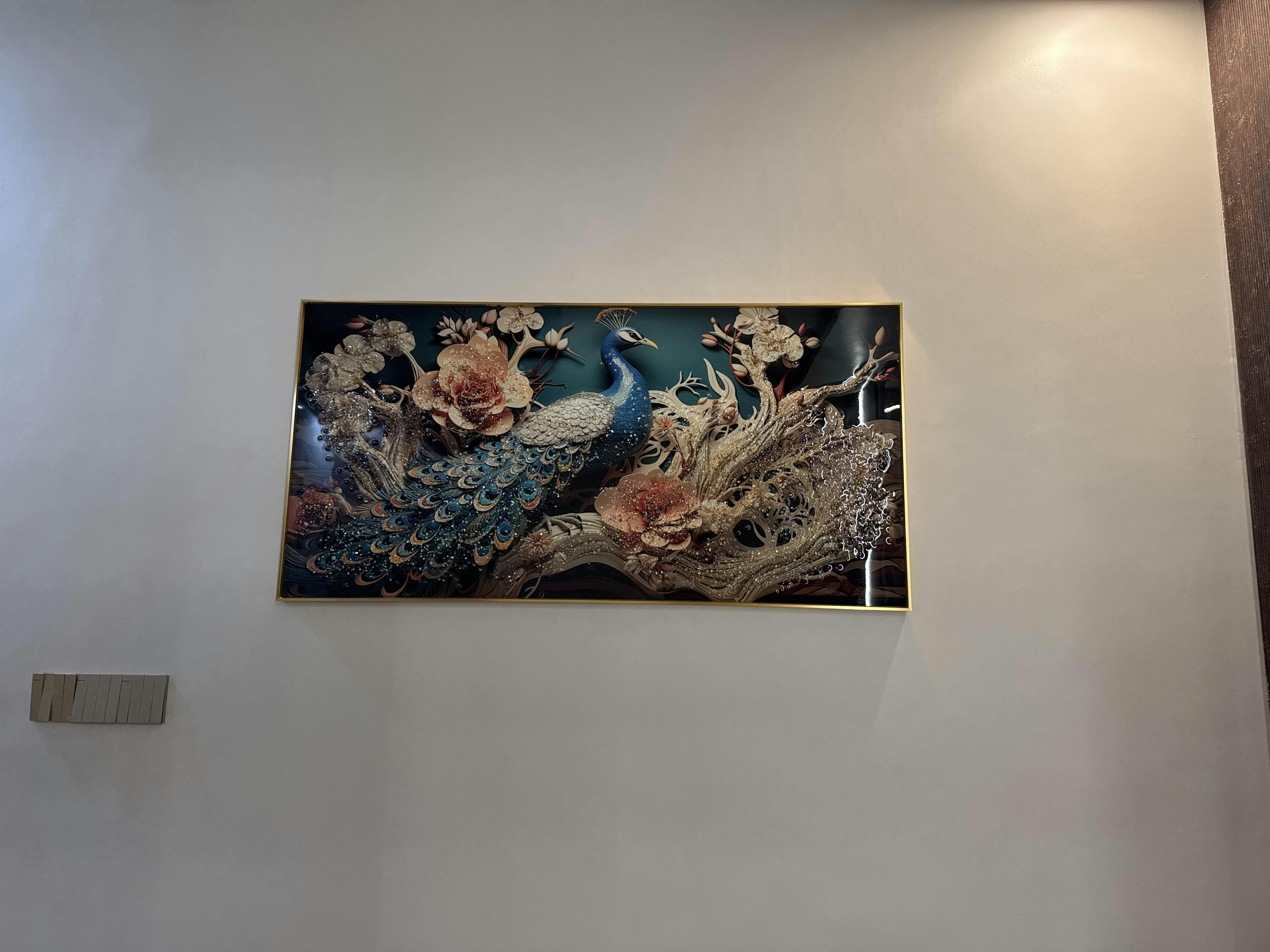 | Experience the serenade of elegance with this exquisite crystal glass painting, featuring the resplendent beauty of peacocks embellished with radiant golden hues and glistening crystal stones. Transform your walls into a canvas of luxury and sophistication with this stunning artwork, which serves as a captivating focal point for any room. Ideal for those who seek to elevate their home decor with opulent accents, this masterpiece exudes timeless charm and allure. Let the majestic presence of peacocks bring a sense of grandeur and refinement to your living space |