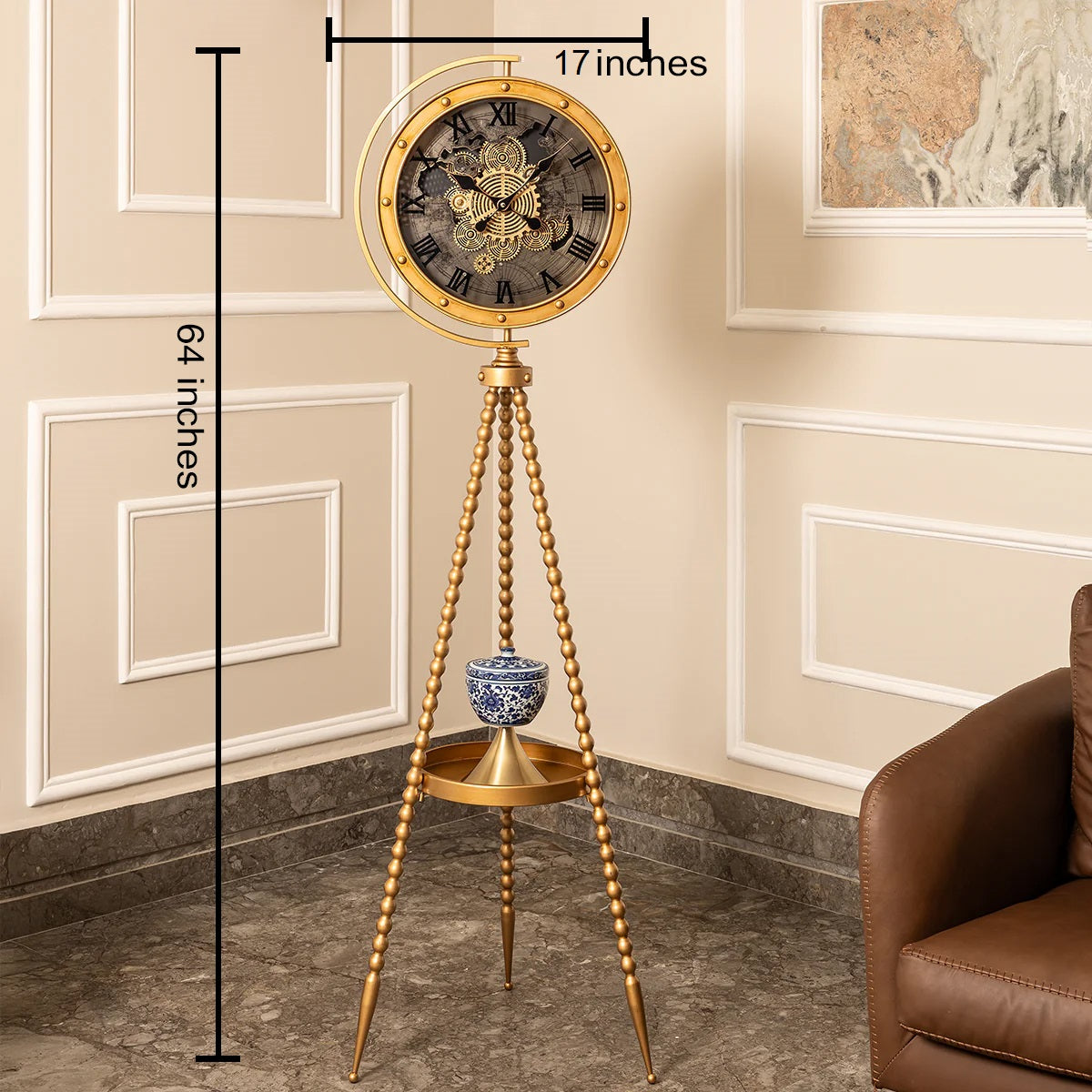 The Moon Phase Gear Floor Clock is a luxurious designer standing clock that beautifully merges mechanical innovation with artistic elegance. Featuring an exposed moving gear mechanism, this timepiece brings motion to life, creating a mesmerizing focal point in any room. The black Roman numeral dial, enclosed in a sleek metal frame, exudes sophistication, while the sturdy tripod stand with a single-tier shelf offers both stability and functional storage. A perfect blend of vintage charm and modern industrial aesthetics, this statement clock is ideal for high-end homes, executive offices, or luxury interior spaces, offering a striking combination of style, functionality, and precision craftsmanship.