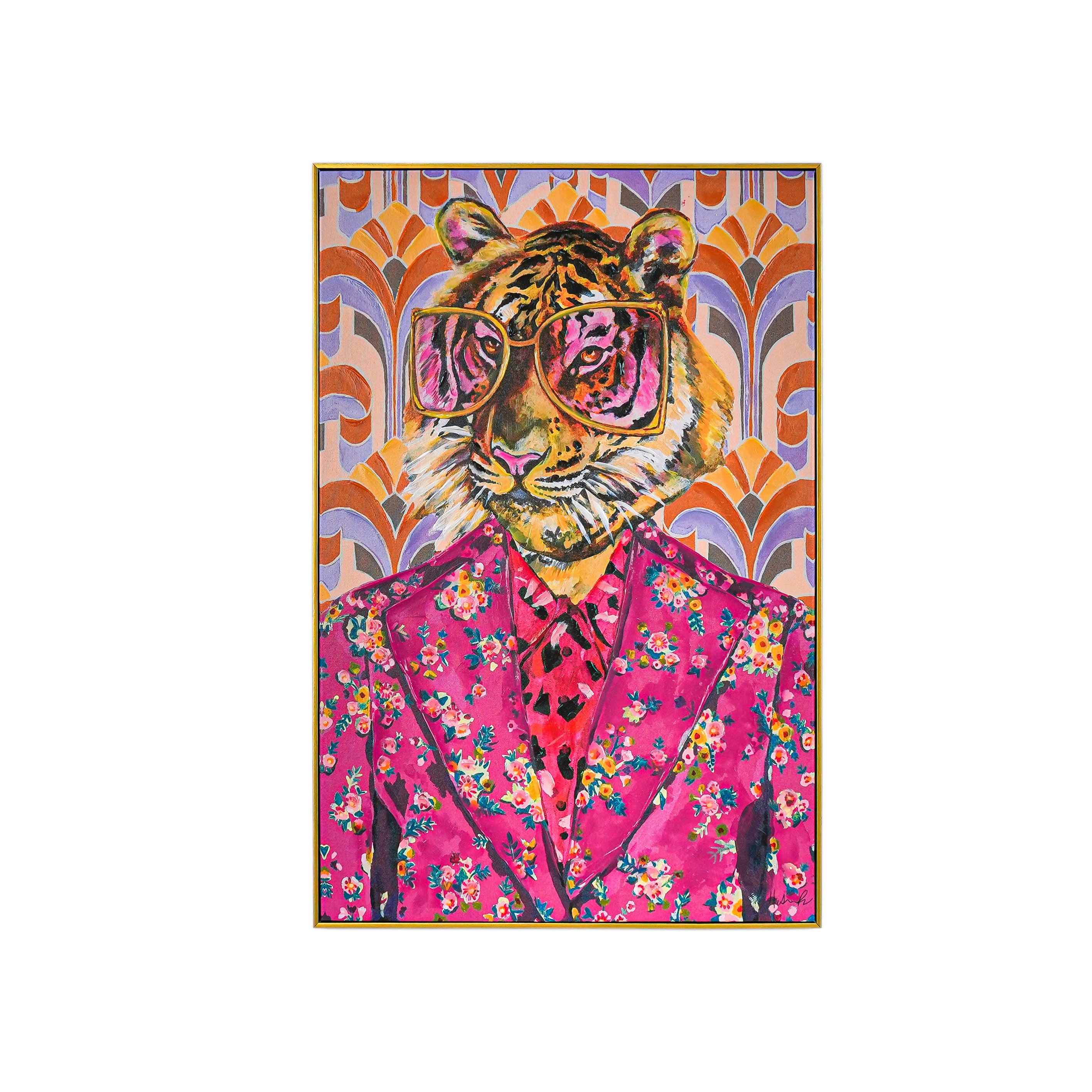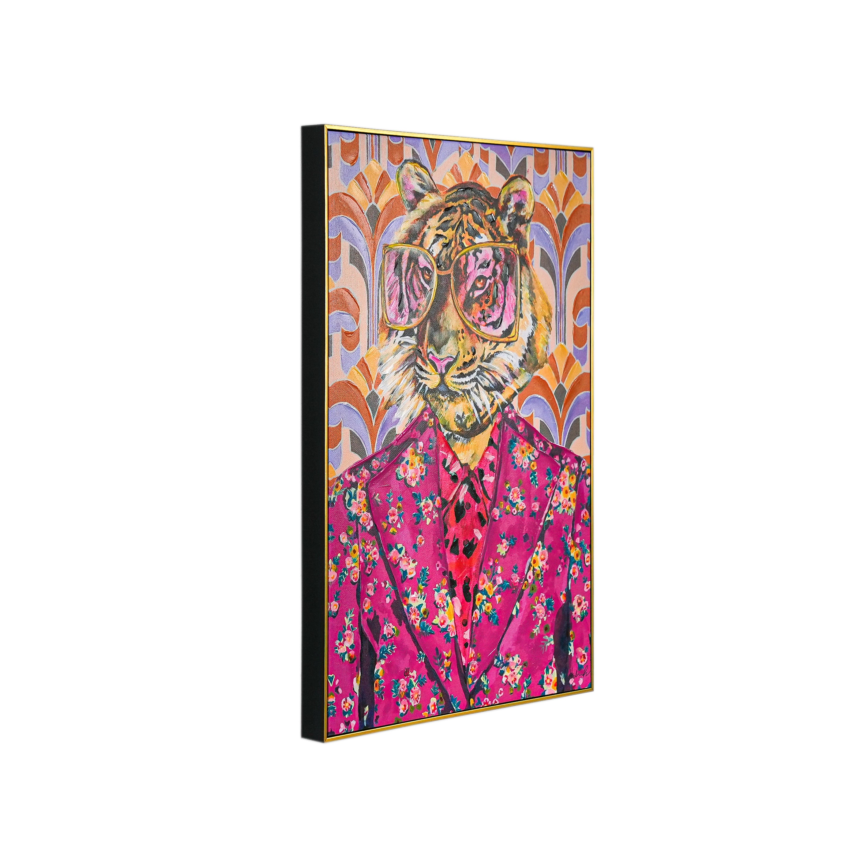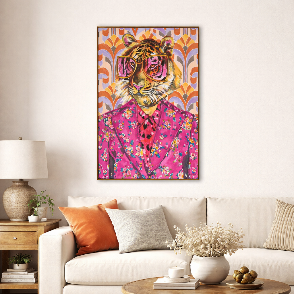 This eye - catching artwork showcases a tiger sporting oversized gold - framed glasses and a vibrant pink floral suit, complemented by a leopard - patterned tie. The backdrop is a retro - tinged geometric design bursting with bold shades of orange, purple, and soft pastels. Merging whimsical charm with vintage - inspired style and modern artistic flair, this piece infuses any room with personality and conversation - starting appeal. It’s a unique fusion of wildlife spirit and retro fashion, perfect for art lovers seeking a bold, playful statement.