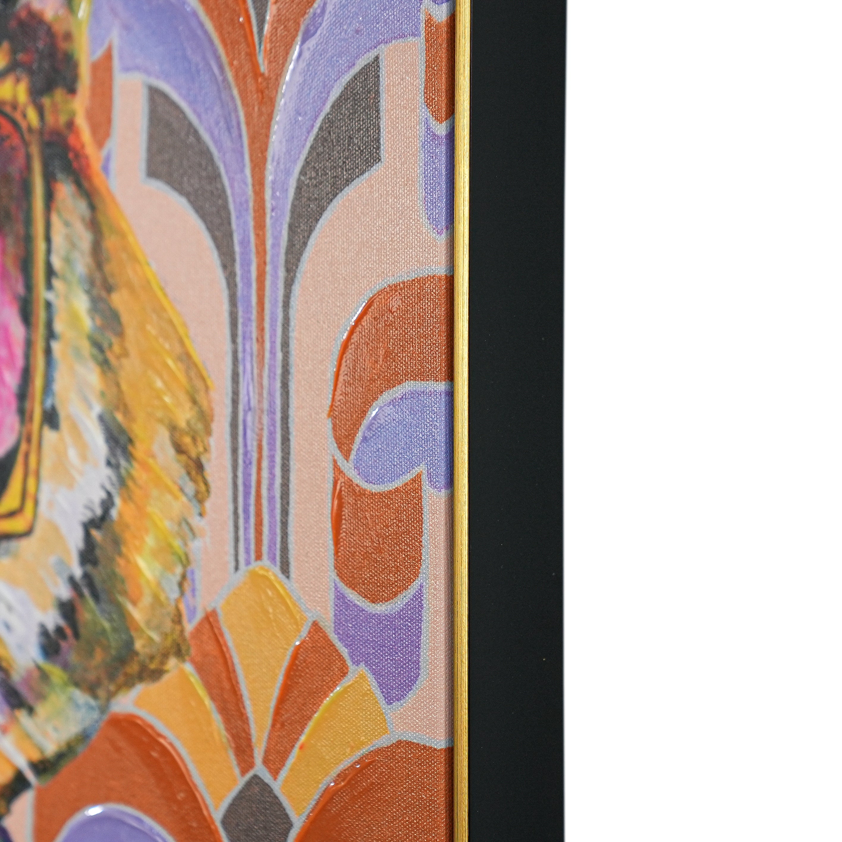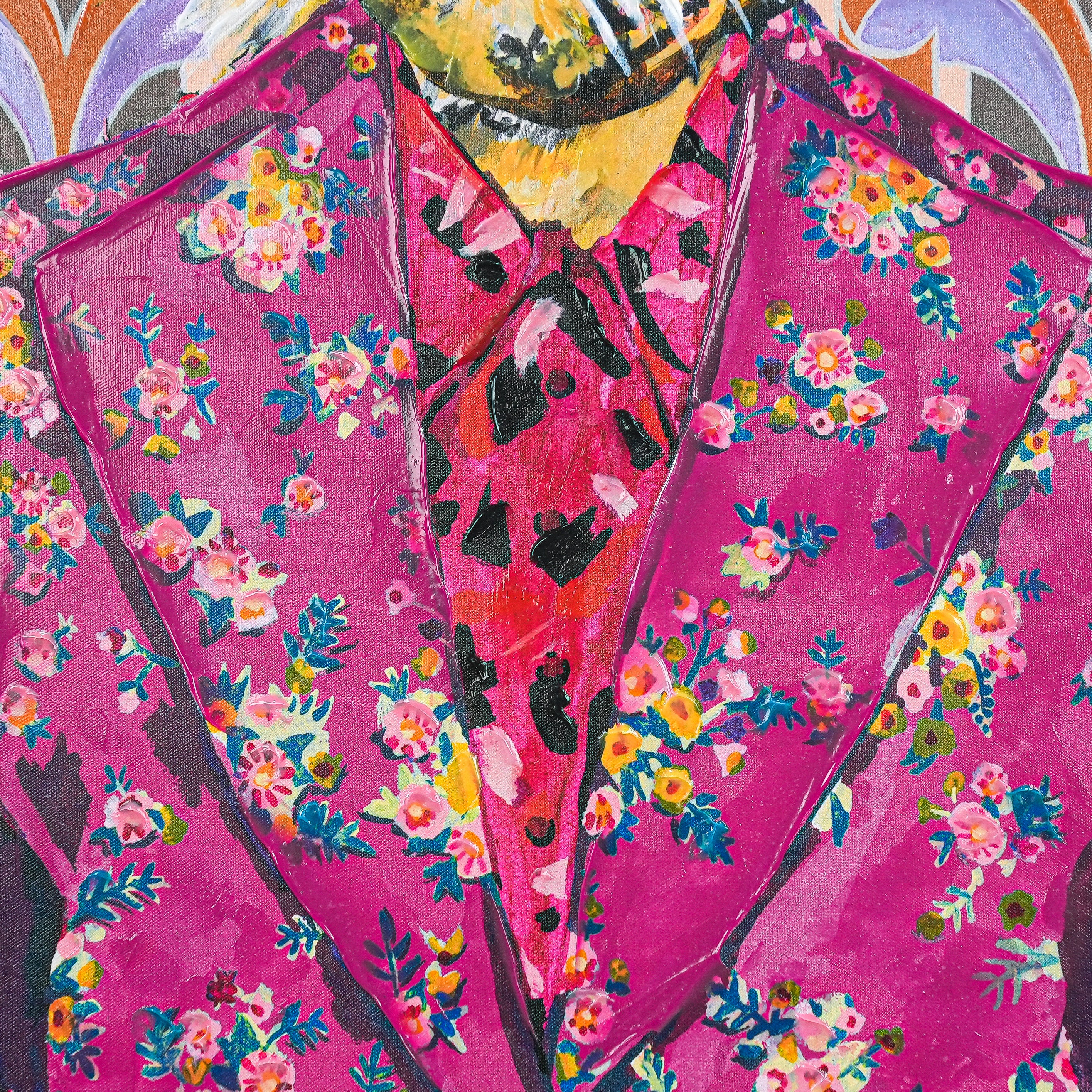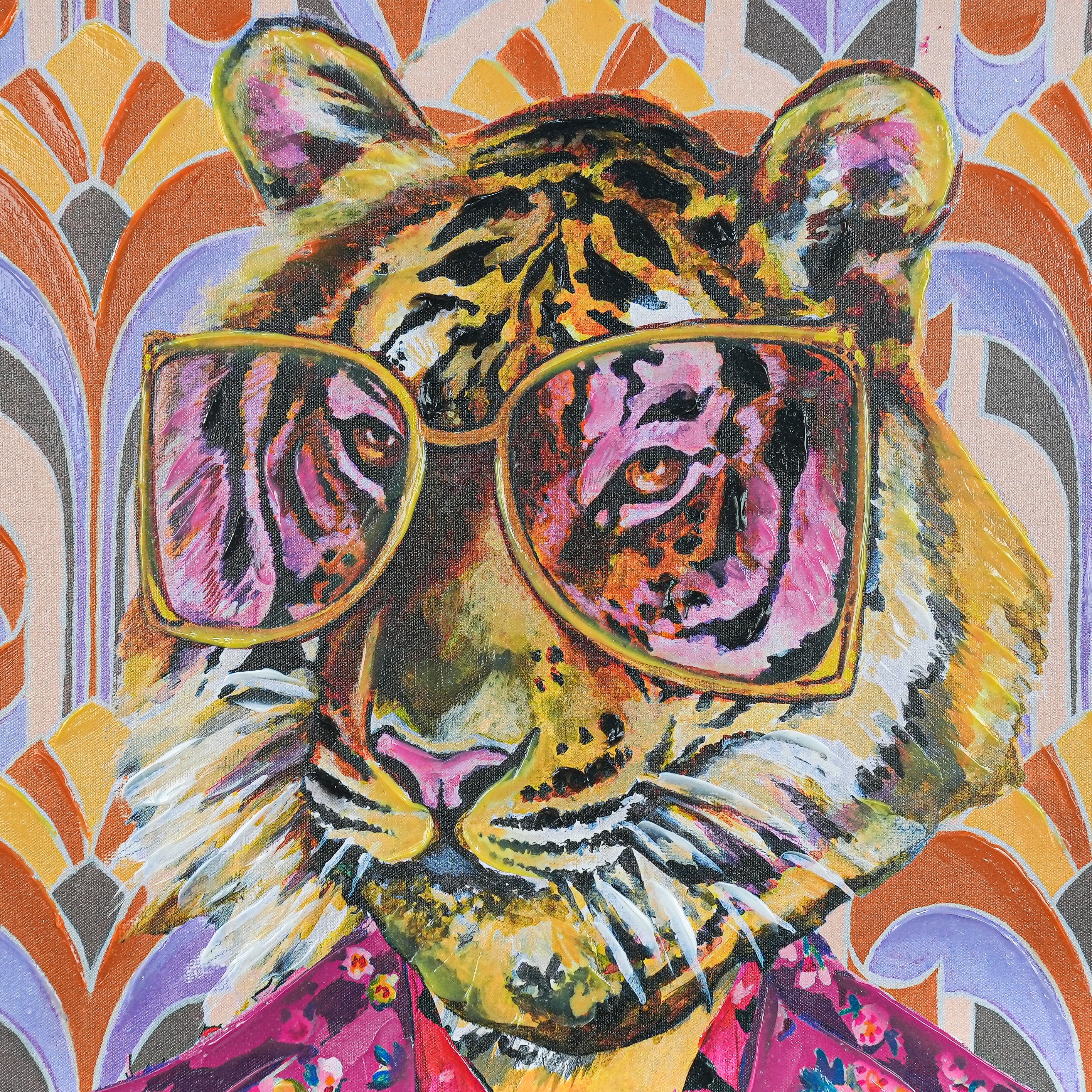 This eye - catching artwork showcases a tiger sporting oversized gold - framed glasses and a vibrant pink floral suit, complemented by a leopard - patterned tie. The backdrop is a retro - tinged geometric design bursting with bold shades of orange, purple, and soft pastels. Merging whimsical charm with vintage - inspired style and modern artistic flair, this piece infuses any room with personality and conversation - starting appeal. It’s a unique fusion of wildlife spirit and retro fashion, perfect for art lovers seeking a bold, playful statement.