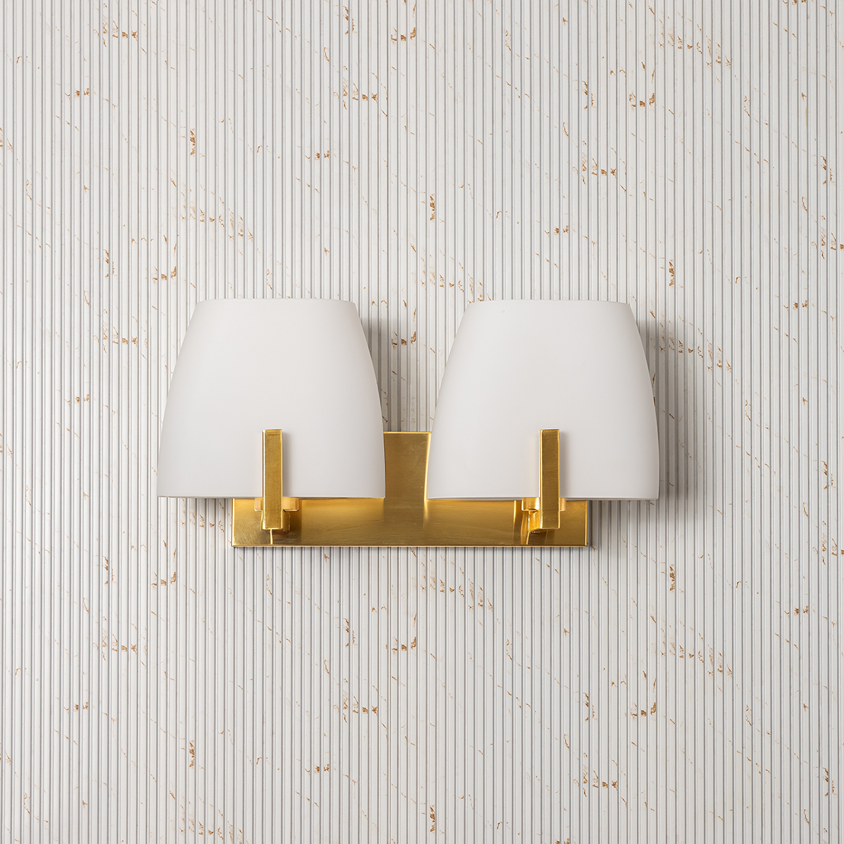 This elegant dual-shade wall light brings a perfect balance of symmetry and sophistication to refined interiors. Designed with two beautifully proportioned tapered shades, it casts a soft, warm glow that creates a cozy and inviting atmosphere. The clean rectangular backplate and sleek vertical supports add a structured, contemporary touch, while the overall composition maintains a timeless appeal. Its balanced design makes it ideal for bedrooms, vanity areas, living rooms, or upscale hospitality spaces where both style and functionality matter. The warm illumination enhances surrounding décor without overpowering the space, making it suitable for modern as well as transitional settings. Whether installed as a statement piece or as part of a coordinated lighting layout, this fixture delivers understated elegance and graceful charm.