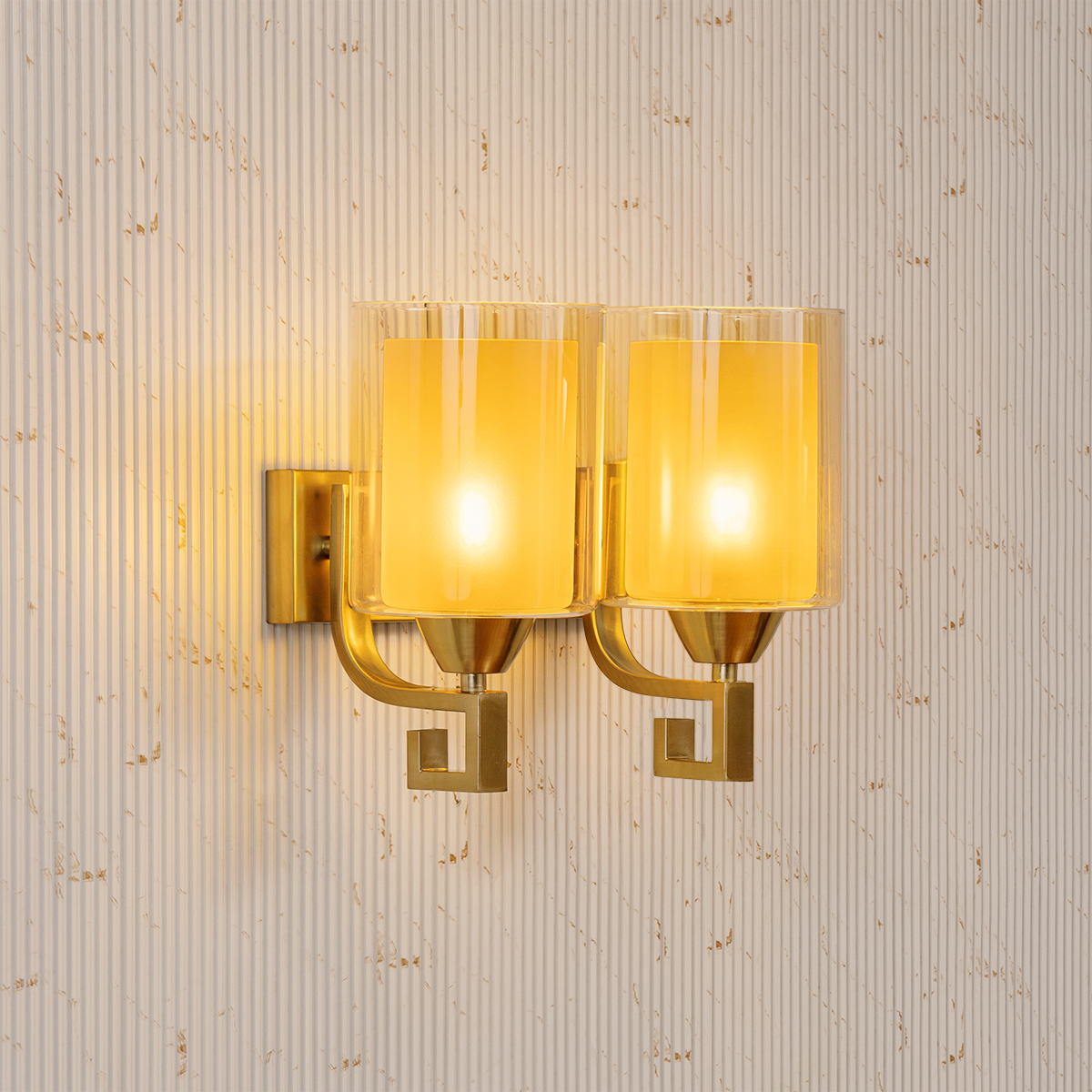 This sophisticated dual wall light showcases a harmonious blend of modern structure and timeless elegance. Featuring two sleek cylindrical shades, it casts a soft, warm glow that enhances the ambiance of any refined interior. The clean rectangular backplate provides a balanced foundation, while the gracefully curved arms with distinctive angular detailing add a subtle architectural character. Its symmetrical composition creates visual stability and makes it ideal for bedrooms, hallways, living rooms, or stylish hospitality settings where layered illumination is desired. The smooth contours and polished finish contribute to its upscale appeal without overwhelming the décor. Designed to function as both a decorative accent and a practical lighting solution, this fixture effortlessly elevates contemporary and transitional spaces with understated luxury.