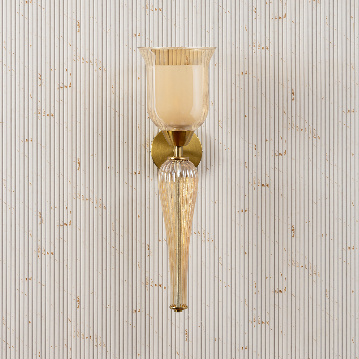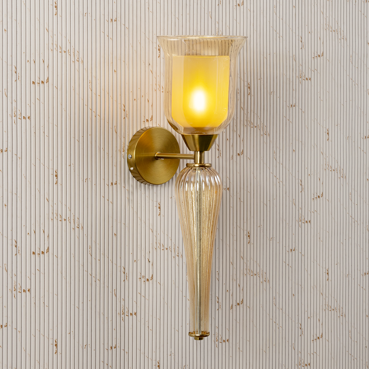 This elegant wall light is a striking blend of graceful design and timeless sophistication. Featuring a beautifully flared shade that softly diffuses light, it creates a warm and inviting ambiance ideal for refined interiors. The structured backplate and sleek arm provide a clean foundation, while the elongated sculpted detailing beneath the light adds depth and dramatic visual appeal. Its flowing silhouette brings a sense of movement and luxury, making it a captivating focal point on any wall. Perfect for bedrooms, hallways, living spaces, or upscale hospitality settings, this fixture delivers both functional illumination and decorative charm. The balanced proportions and soft glow enhance surrounding décor effortlessly, elevating the overall atmosphere with understated elegance and classic style.