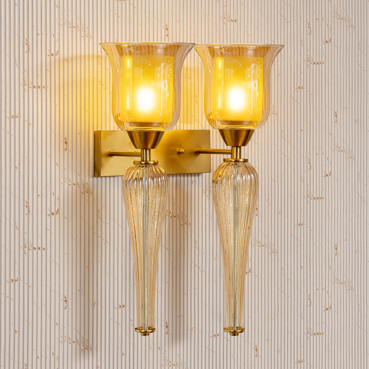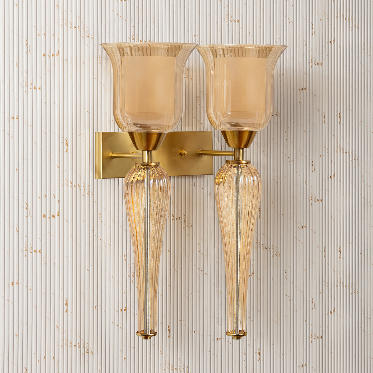 This stunning dual wall light is a true statement of elegance and refined artistry, designed to elevate sophisticated interiors. Featuring two gracefully flared shades that softly diffuse illumination, it creates a warm and inviting ambiance perfect for enhancing living spaces. The elongated, sculpted detailing beneath each light adds dramatic visual depth and a sense of flowing movement, giving the fixture a luxurious and eye-catching presence. Anchored by a clean, structured backplate, its symmetrical design ensures balance while maintaining a bold decorative appeal. Ideal for bedrooms, hallways, formal living rooms, or upscale hospitality settings, this wall light serves as both a functional lighting solution and a striking accent piece. Its harmonious proportions and timeless silhouette make it a perfect addition to interiors that celebrate elegance and grandeur.