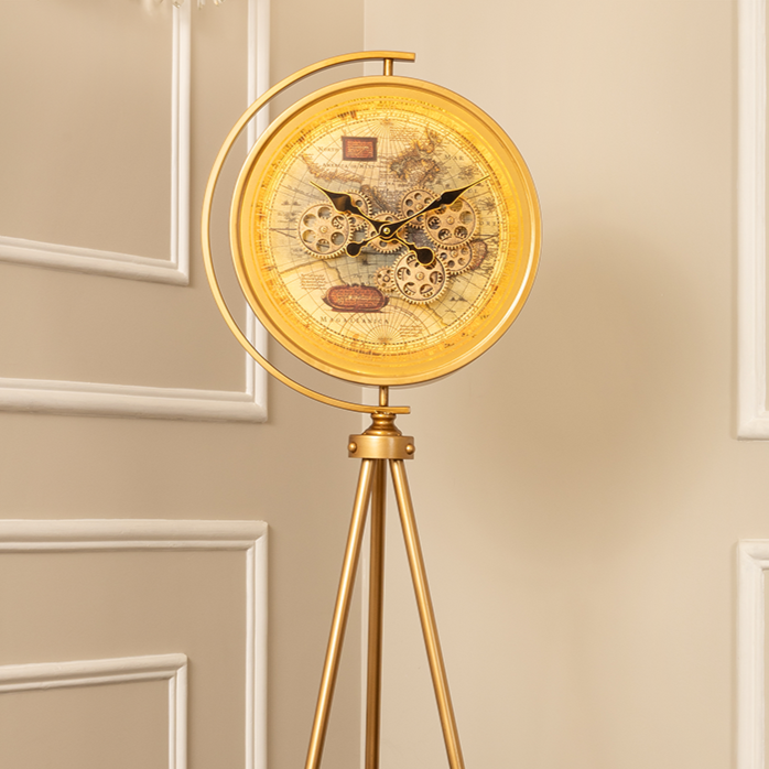 Timeless Tradition Tripod Base Luxury Designer Floor Clock With Moving Gear Mechanism (Steel Body) (With Light & Remote)